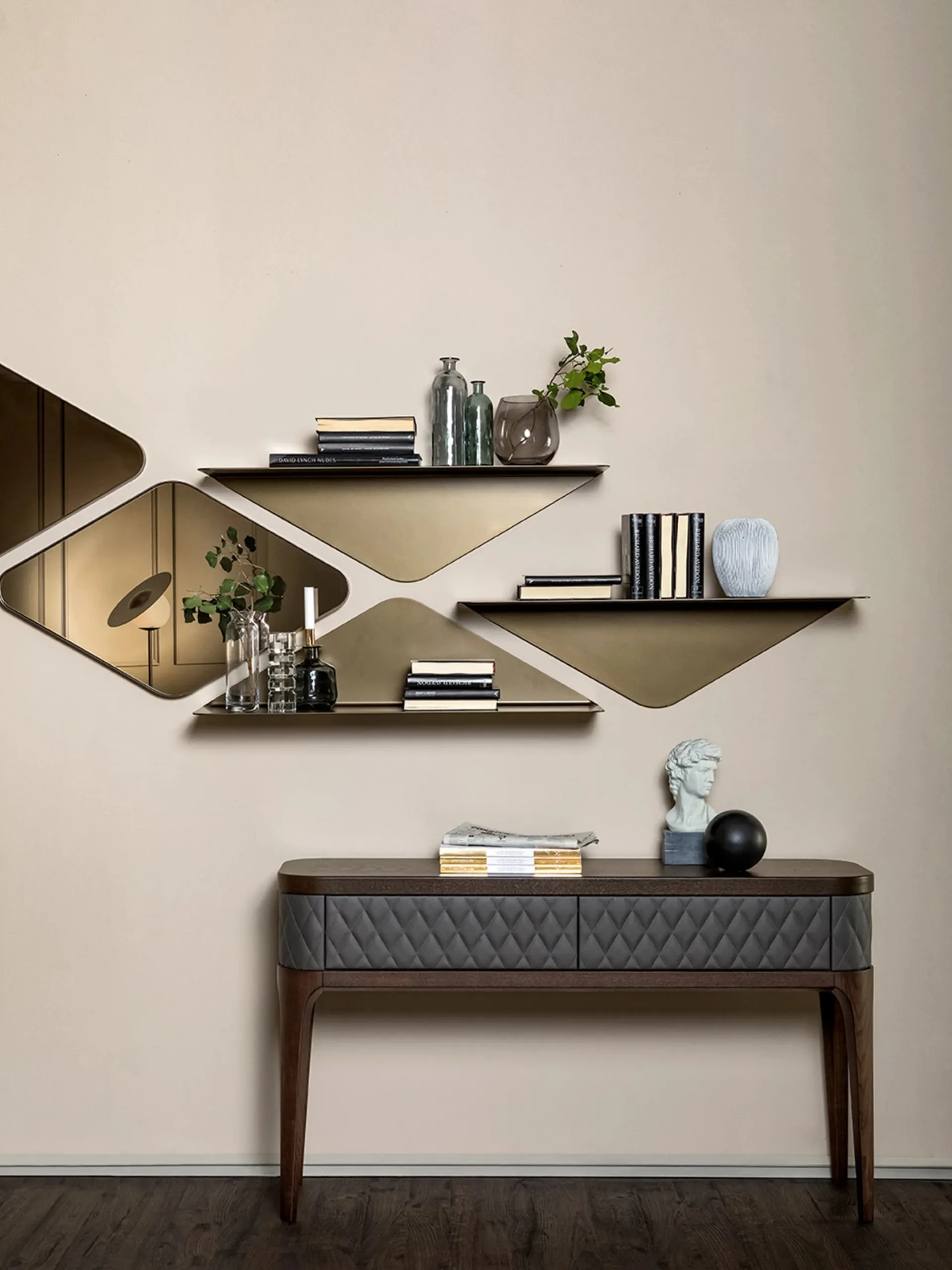 Nella selezione di mobili e oggetti accessori di qualità per la casa, è imprescindibile affiancare in un ottimo mix le doti di contenuto estetico e di funzionalità. Dopo avere comprato i mobili per la tua casa, dovrai impreziosire gli spazi indoor con i plurifunzionali Complementi di grande valore decorativo che proponiamo. Se vuoi un complemento di qualità eccellente per valorizzare i tuoi arredi, farci visita significherà toccare con mano le migliori proposte sul mercato. Per quanto concerne le finiture, i Complementi moderni garantiscono molteplici possibilità estetiche per ammobiliare gli ambienti secondo le proprie esigenze. Mensole Matrix in metallo con specchio romboidale di Tonin Casa in metallo: appartiene alla ricca offerta di Complementi moderni del noto e conosciuto marchio, sempre di grande valore.