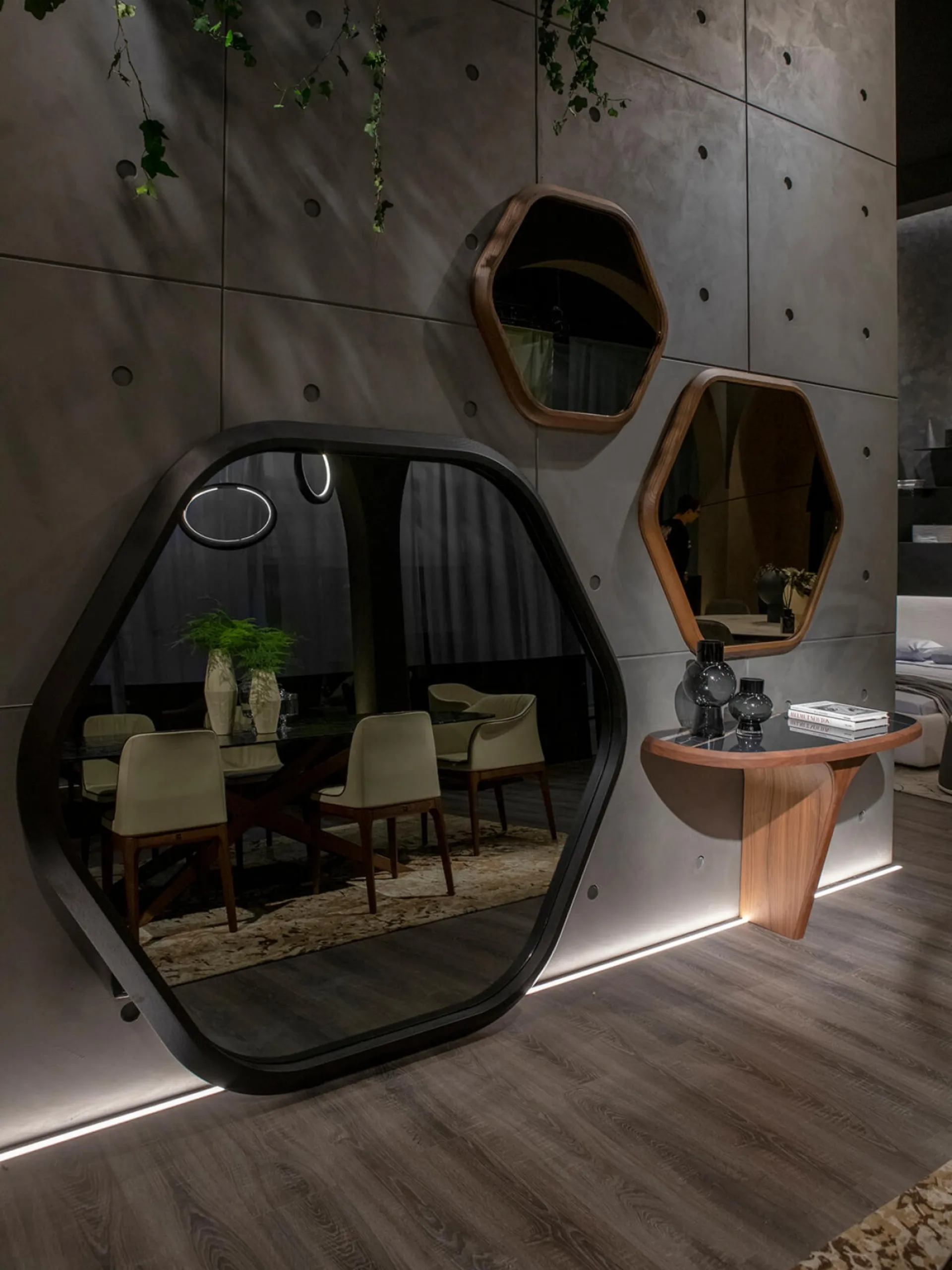 Le composizioni arredative di alto valore estetico del brand Tonin Casa valorizzano l'ambiente con i loro colori e gusto, ricreando particolari atmosfere arredative. Molto versatili e multifunzionali, i Complementi moderni in legno svolgono funzioni disparate: completano le doti di funzionalità e l'estetica del locale. Nel nostro showroom potrai visionare in prima persona l'eccellenza dei modelli di specchi moderni in legno del brand, proprio come questa soluzione in foto. Complementi e specchi personalizzano l'arredo di casa, occupando lo spazio in modo utile e rendendolo accogliente e bello da vedere. Specchio esagonale Hive di Tonin Casa in legno: darà carattere e charme a un interno ammobiliato con mobili e oggetti accessori dai richiami moderni.
