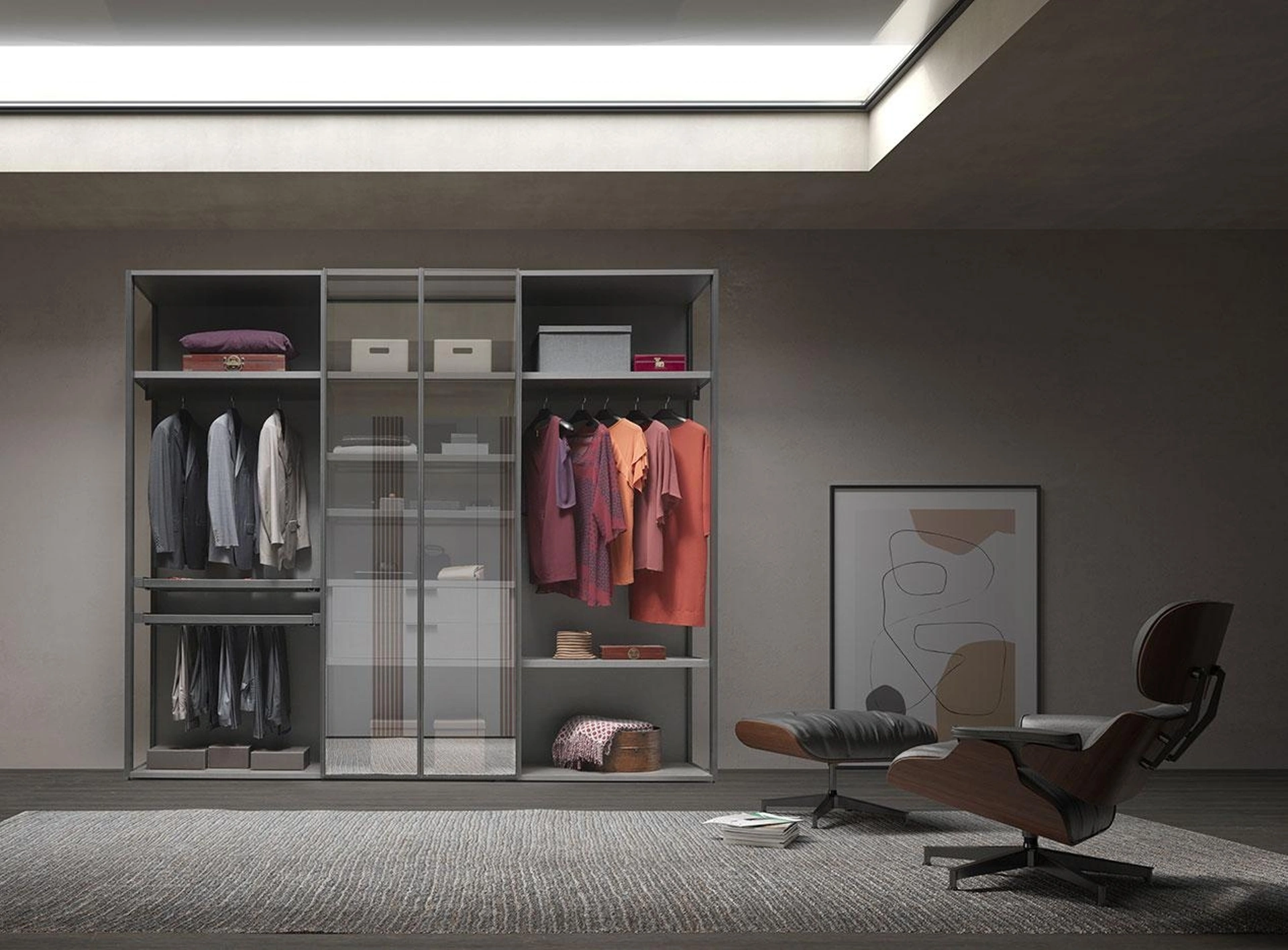 Per progettare alla perfezione una stanza pratica e sofisticata, opta per le più belle soluzioni dei migliori produttori, letti, armadi e comò di elevata qualità. Gli Armadi a muro con ante battenti sono elementi essenziali nella camera da letto, per renderla ben arredata, pratica e completa di tutto. Contattaci e ottieni informazioni sulla nostra collezione di Arredamento Casa: sarai in grado di completare la zona notte potendo usufruire di una ampia offerta di contenitori moderni, come l'armadio in vetro nella fotografia.