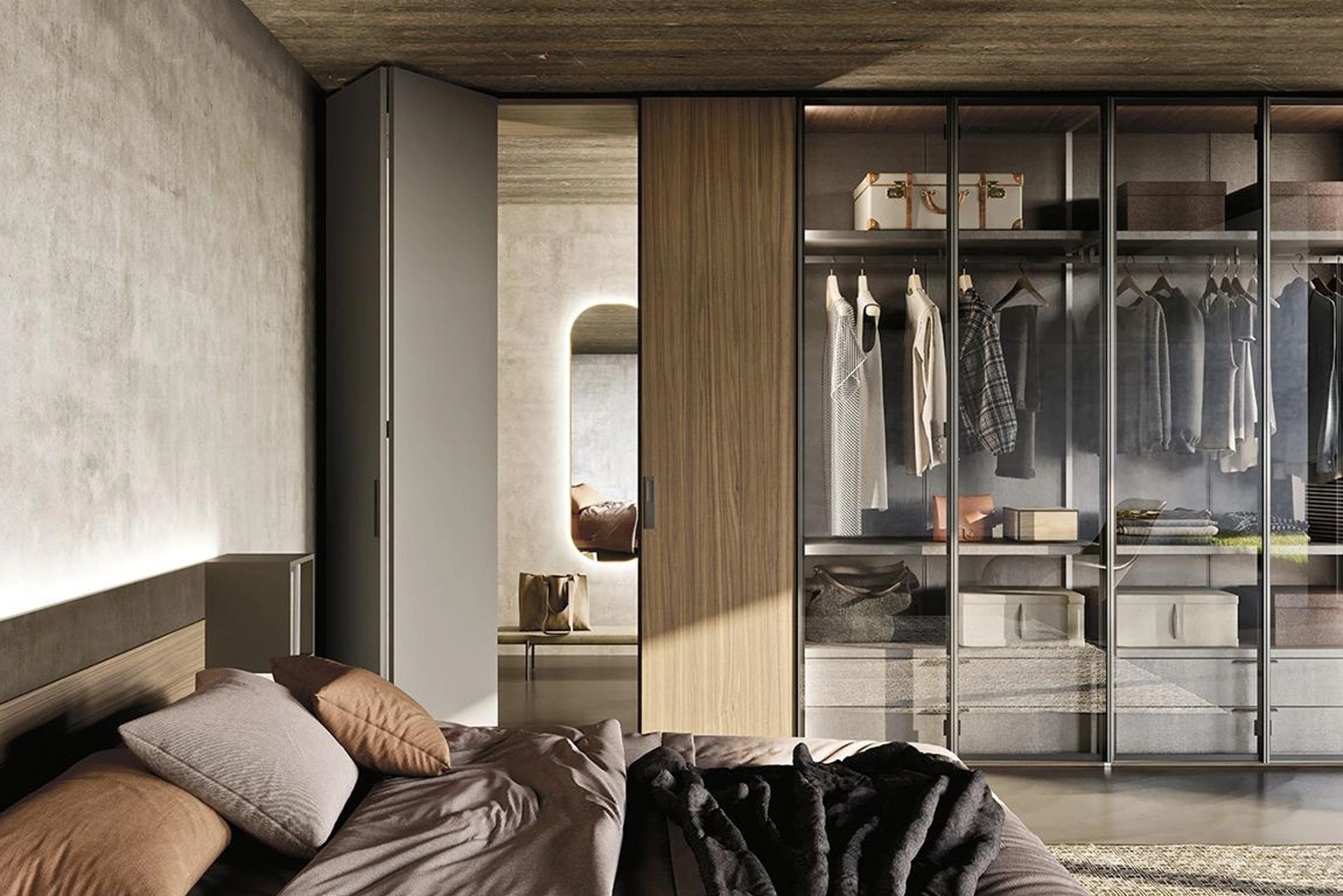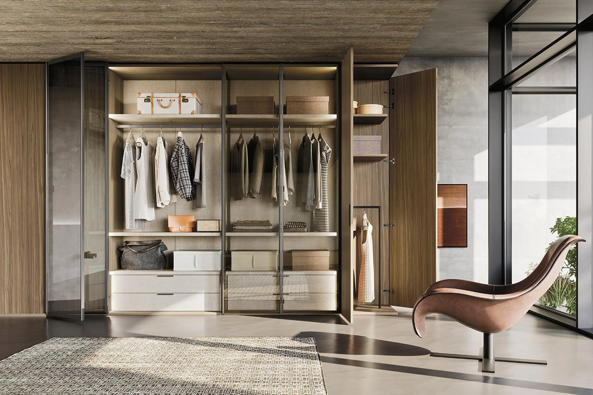 Se sei alla ricerca di armadiature a muro con ante a soffietto, clicca e scopri l'armadio Comp N06A di Mobilgam in vetro.