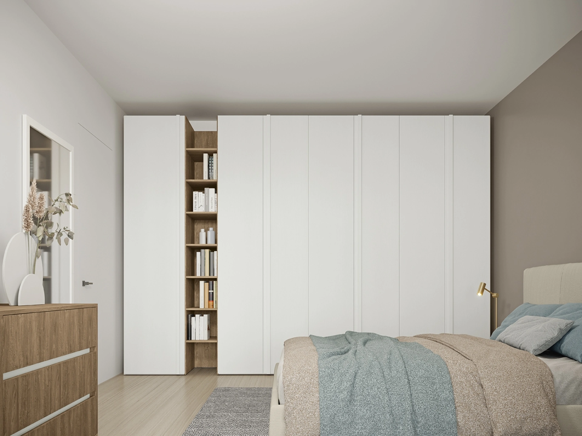 Contattaci e scopri di più sulla nostra serie di Arredamento Casa: avrai la possibilità di completare la camera da letto avendo a disposizione una diversificata offerta di contenitori moderni, come l'armadio in melaminico nella fotografia. Per progettare al meglio una stanza bella e di grande qualità, opta per le più esclusive soluzioni delle migliori marche, letti, armadi e comò di grande design. Gli Armadi a muro con ante battenti sono elementi essenziali nella zona notte, per renderla arredata al meglio, pratica e completa di tutto.