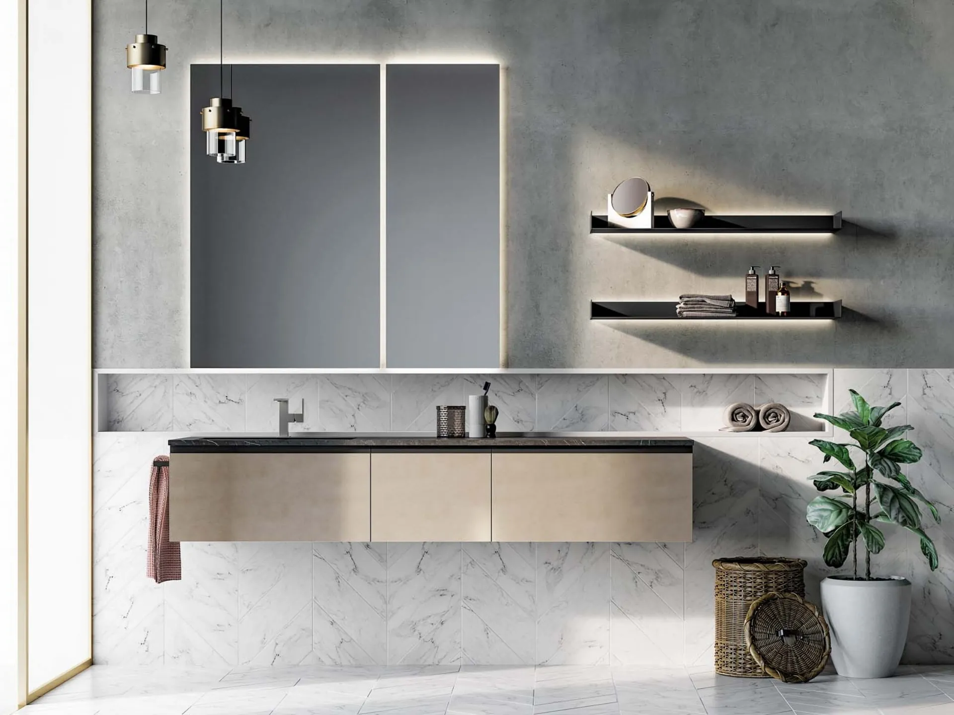 Ottieni informazioni sull'arredo bagno moderno: mobili bagno sospesi in laccato opaco come il modello Gola Up 07 di Birex ti aspettano.