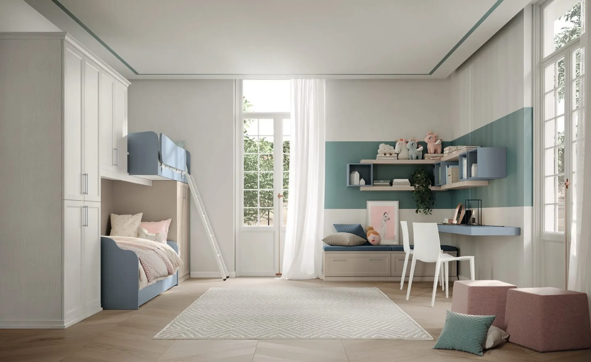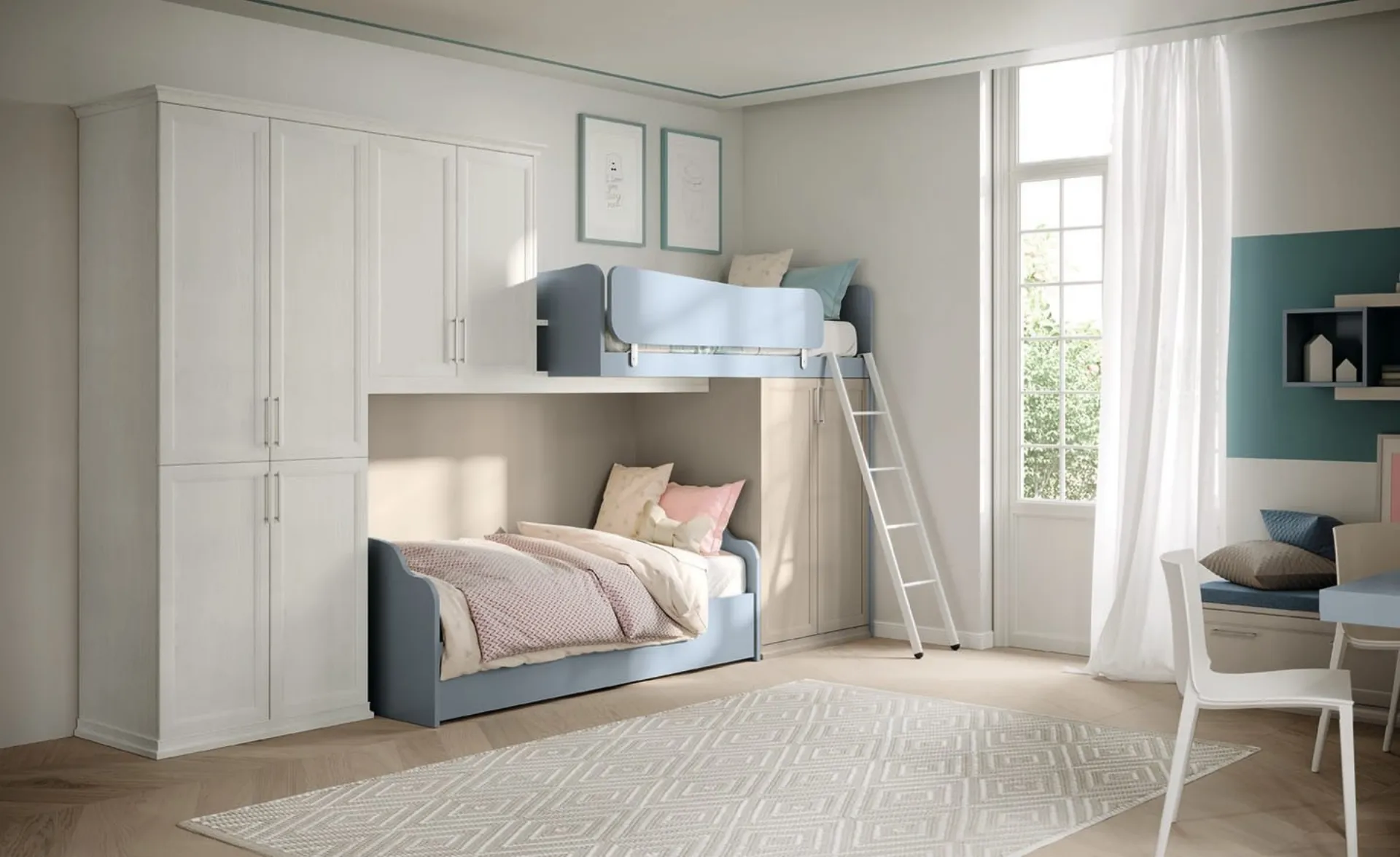 Arreda stanzette classiche con le Camerette a soppalco Colombini Casa! Il modello Arcadia AC024 in melaminico è per bambini.