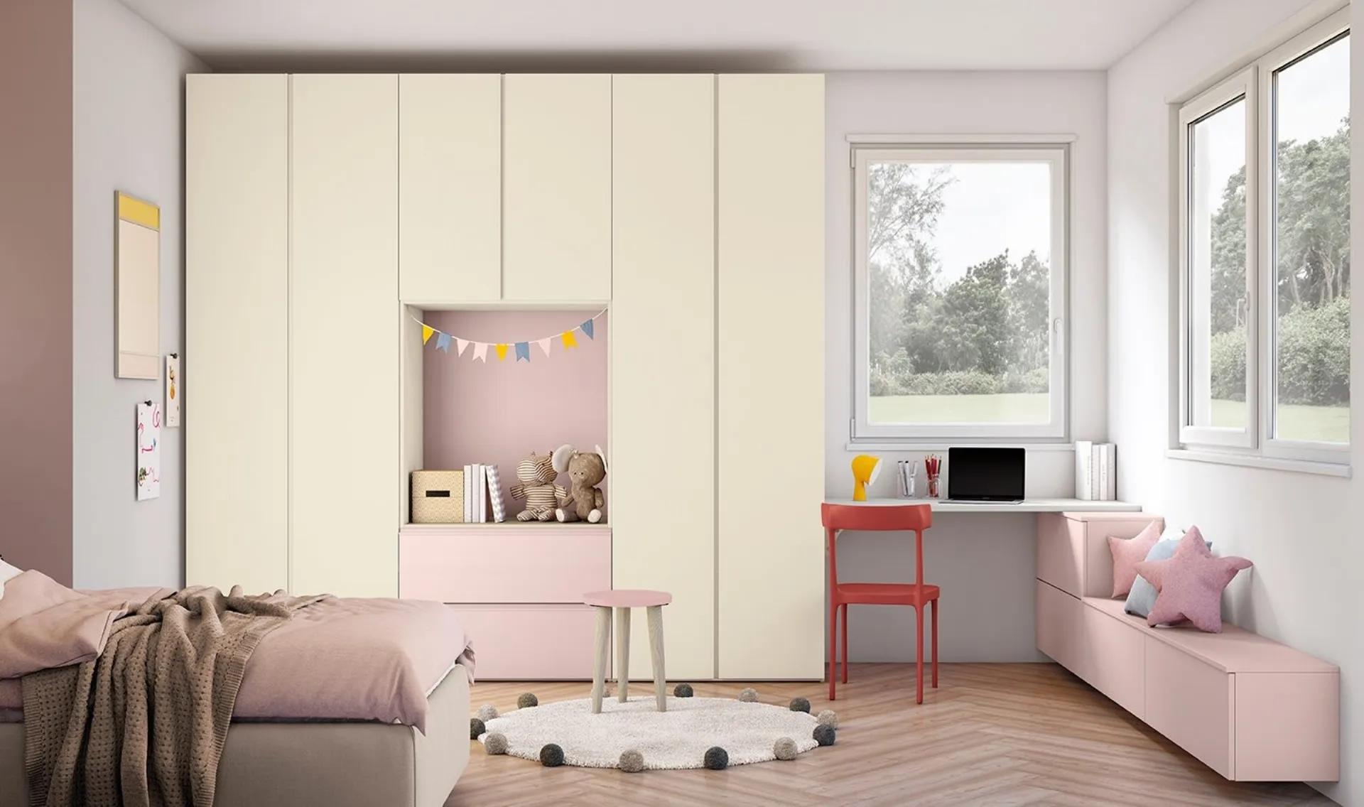 Arreda stanzette moderne con le Camerette componibili Colombini Casa! Il modello Golf K13 in melaminico è per bambine.