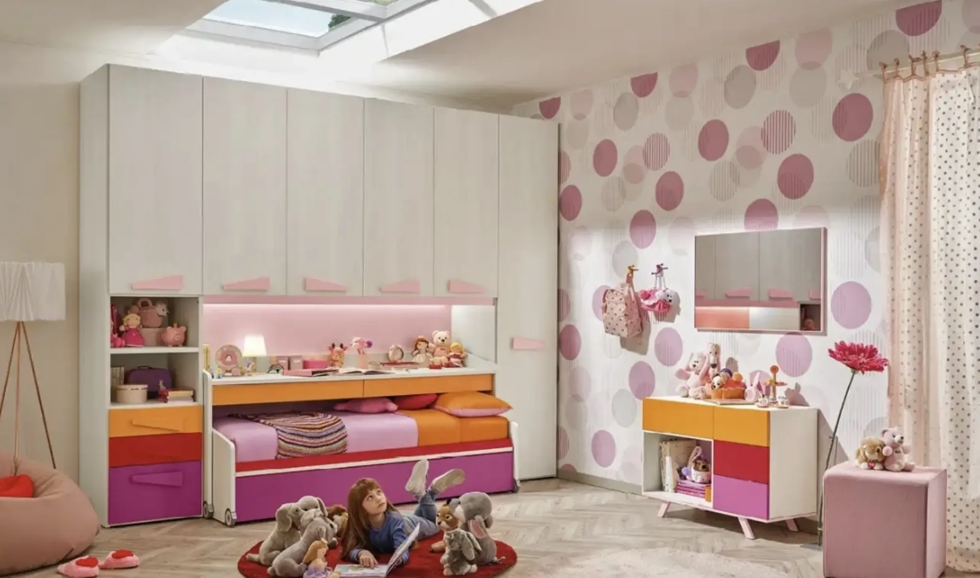 Con questa cameretta KC426 Moretti Compact, tra le soluzioni a ponte, potrai ammobiliare stanze moderne per bambine.