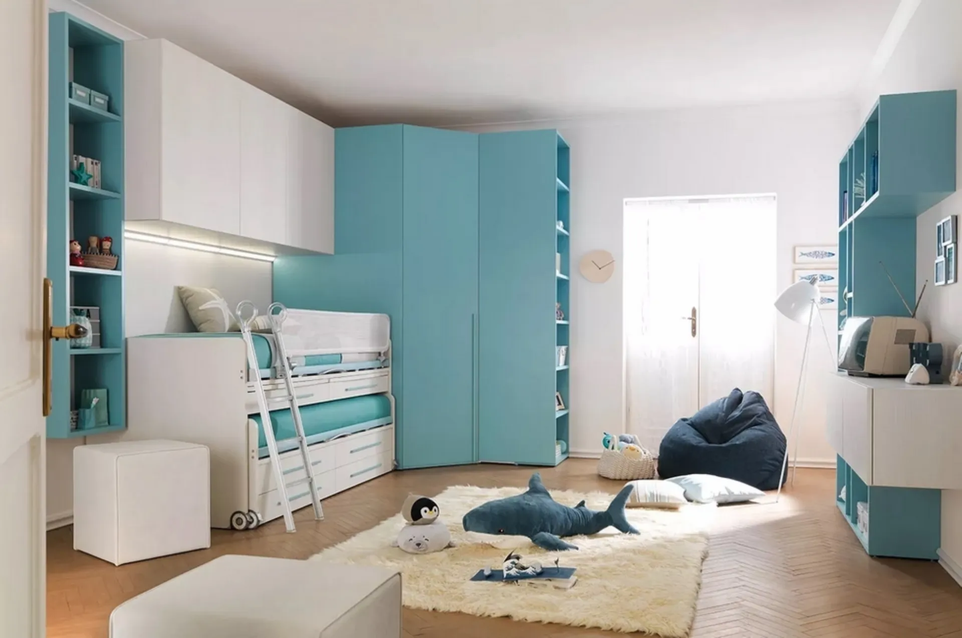 Con questa cameretta KC410 Moretti Compact, tra le soluzioni salvaspazio, potrai ammobiliare stanze moderne per bambini.