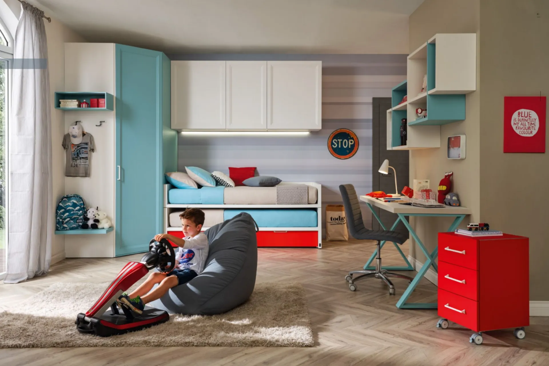 Moretti Compact mette a disposizione un ricco catalogo di elementi accessori da comporre su misura: troverai letto, armadio o cabina armadio, tavolo da lavoro, sedie e librerie. Questa proposta in laccato opaco ultima al meglio le doti di praticità e l'estetica della camaretta, poiché è capace di unire ergonomia e sicurezza. Se cerchi spunti creativi per decorare al meglio la stanza dei tuoi bambini, ti presentiamo la Cameretta a ponte VG101 di Moretti Compact con finitura in laccato opaco. Porta valore estetico e tonalità vivaci nella stanza dedicata ai più piccoli con questa proposta, una delle Camerette a ponte per bambini di Moretti Compact. Nella progettazione della stanza dei piccoli affidati a noi: nel nostro punto vendita presentiamo tutte le più originali composizioni moderne per la loro camera.