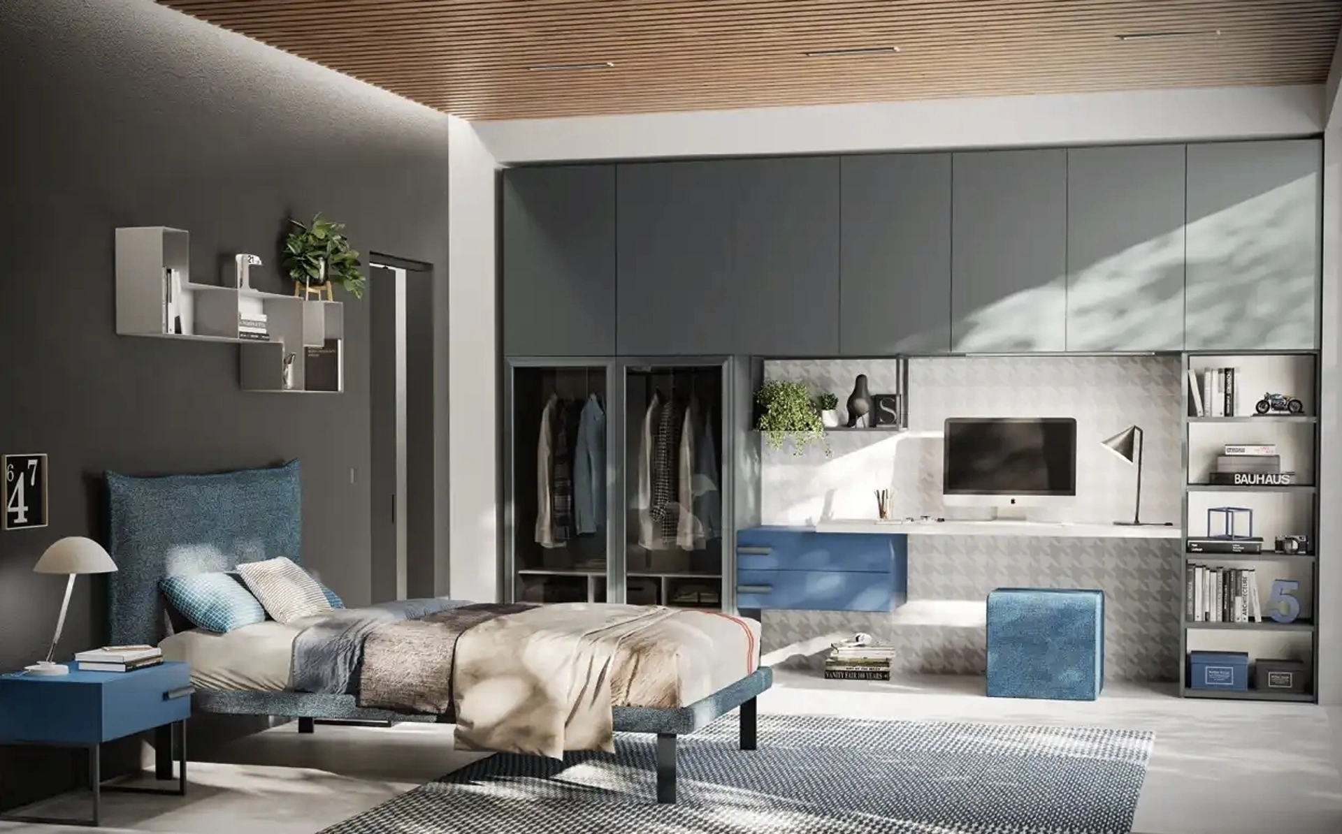 Arreda stanzette design con le Camerette a ponte Moretti Compact Camerette! Il modello Y108 in laccato opaco è per ragazzi.