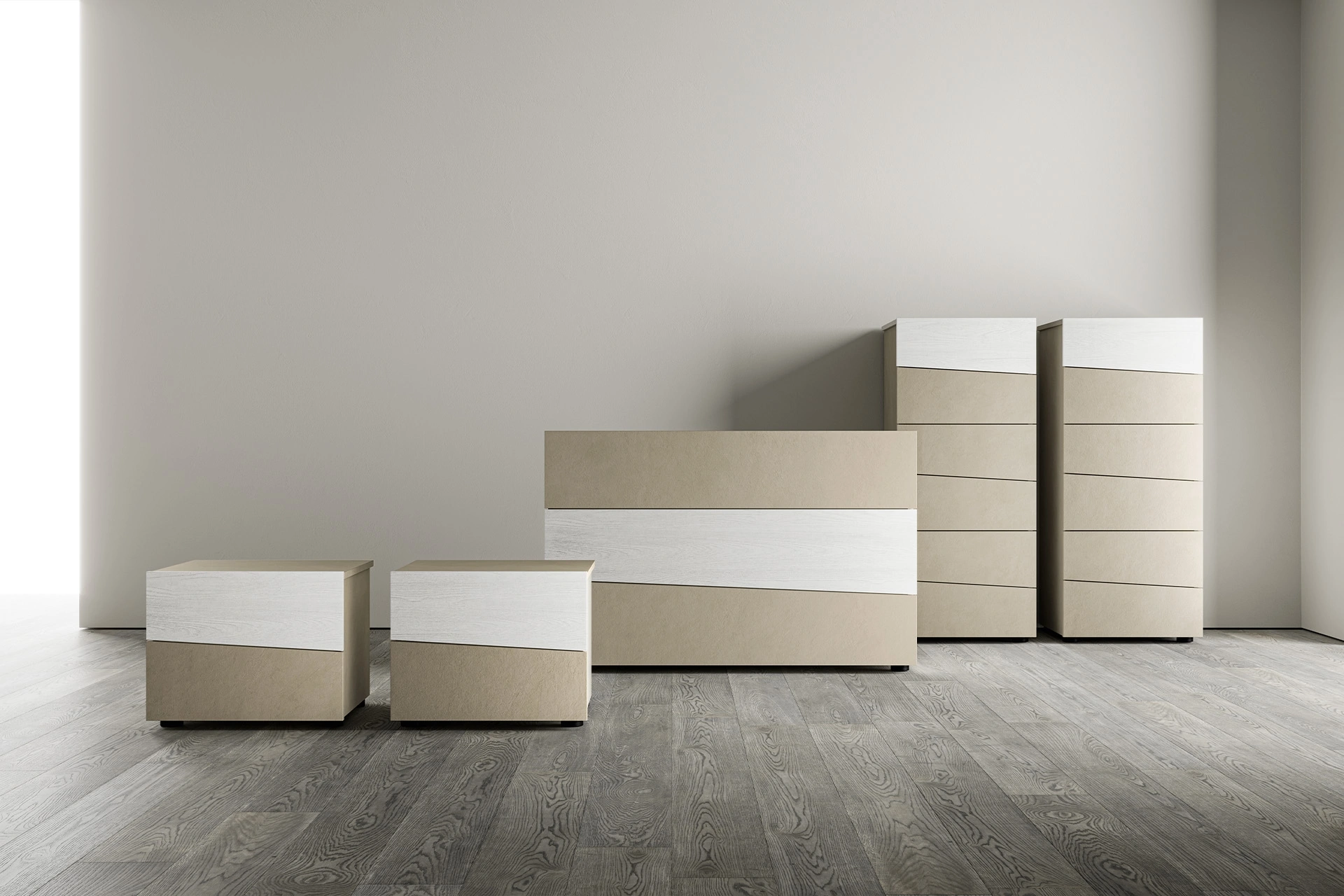 Scopri Comodini moderni e mobili con cassetti SantaLucia! Il modello Ambra Gruppo Notte costruito in melaminico è la soluzione ottimale.