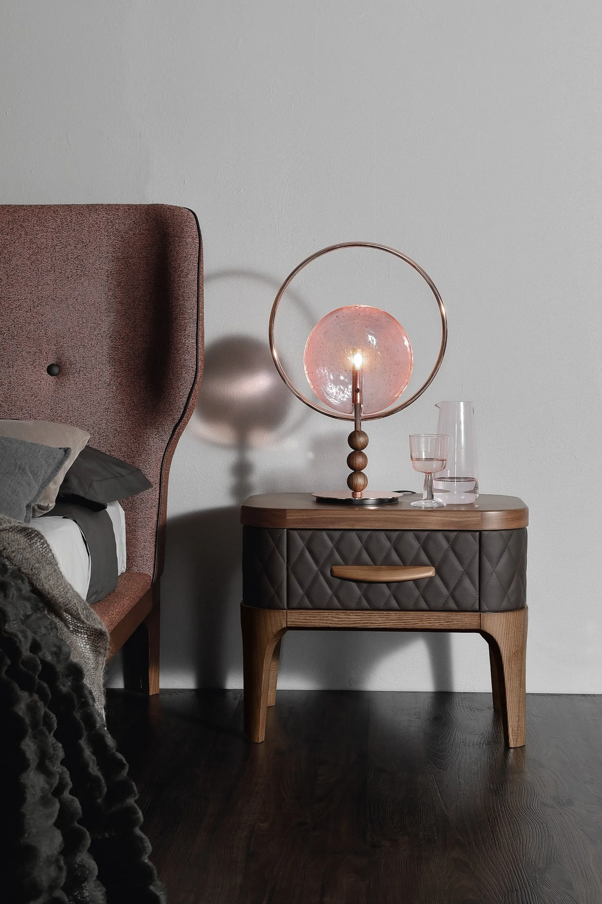 La zona del riposo contiene anche i Comodini: mobili per contenere d'uso quotidiano che permettono di riporre piccole cose e avere a disposizione superfici di appoggio per diversi usi. Comodino Tiffany con frontale rivestito in pelle di Tonin Casa : contattaci e scopri di più sulle nostre proposte d'arredo e arreda la camera come l'avevi sognata. Con i nostri gruppi notte design dell'azienda Tonin Casa, leader dell’Arredamento Casa per la zona del riposo, potrai creare la camera da letto che hai sempre voluto. Valorizza i tuoi interni scegliendo composizioni di arredi abbinati o crea esteticamente gradevoli accostamenti di stile e tonalità grazie al catalogo di mobili ed elementi accessori per la zona del riposo che proponiamo, come il modello in pelle mostrato in foto, anche realizzabili su misura.