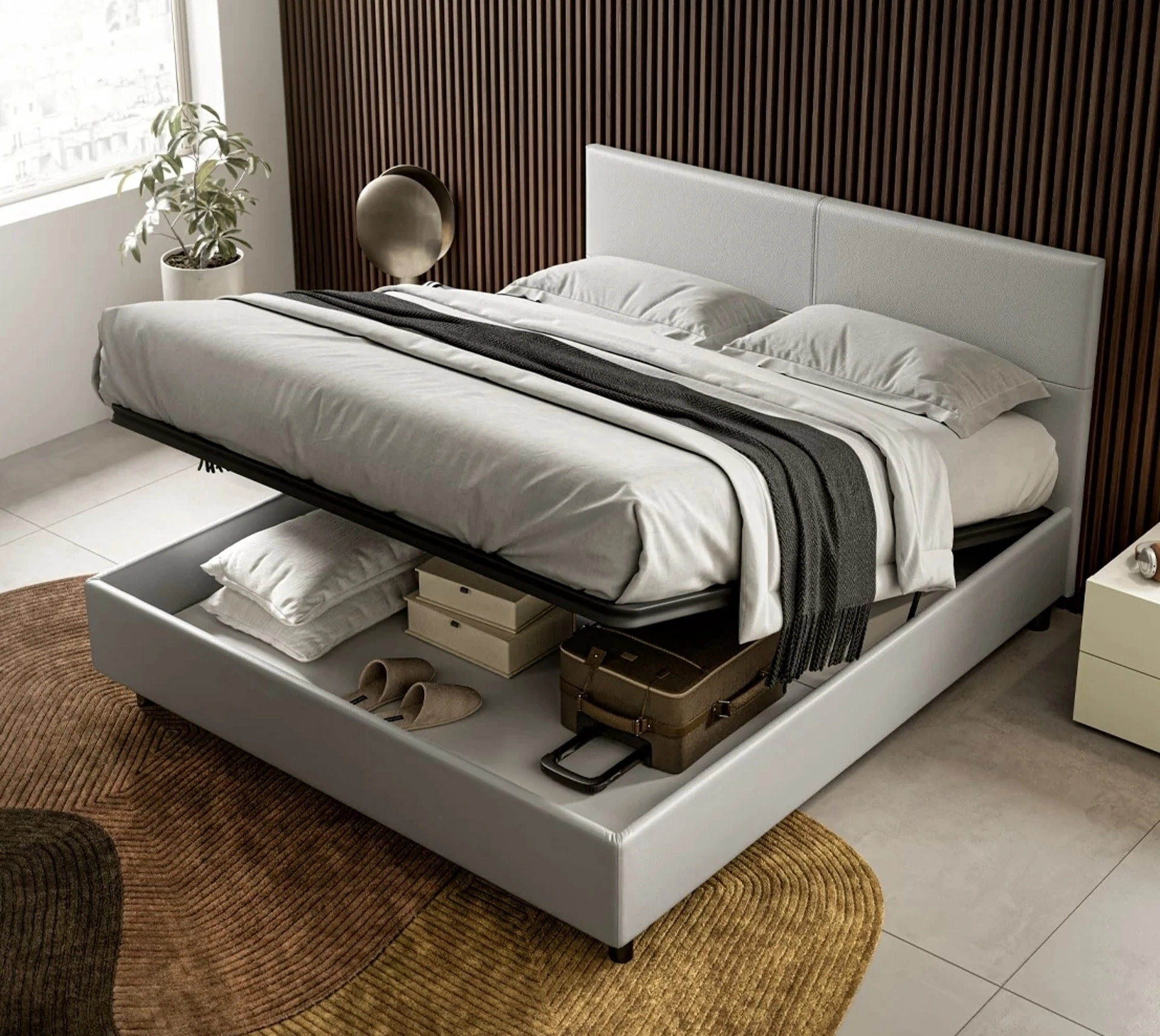 Il letto Bora in ecopelle, tra i modelli con contenitore matrimoniali moderni di SantaLucia, è perfetto per garantirti il relax totale.