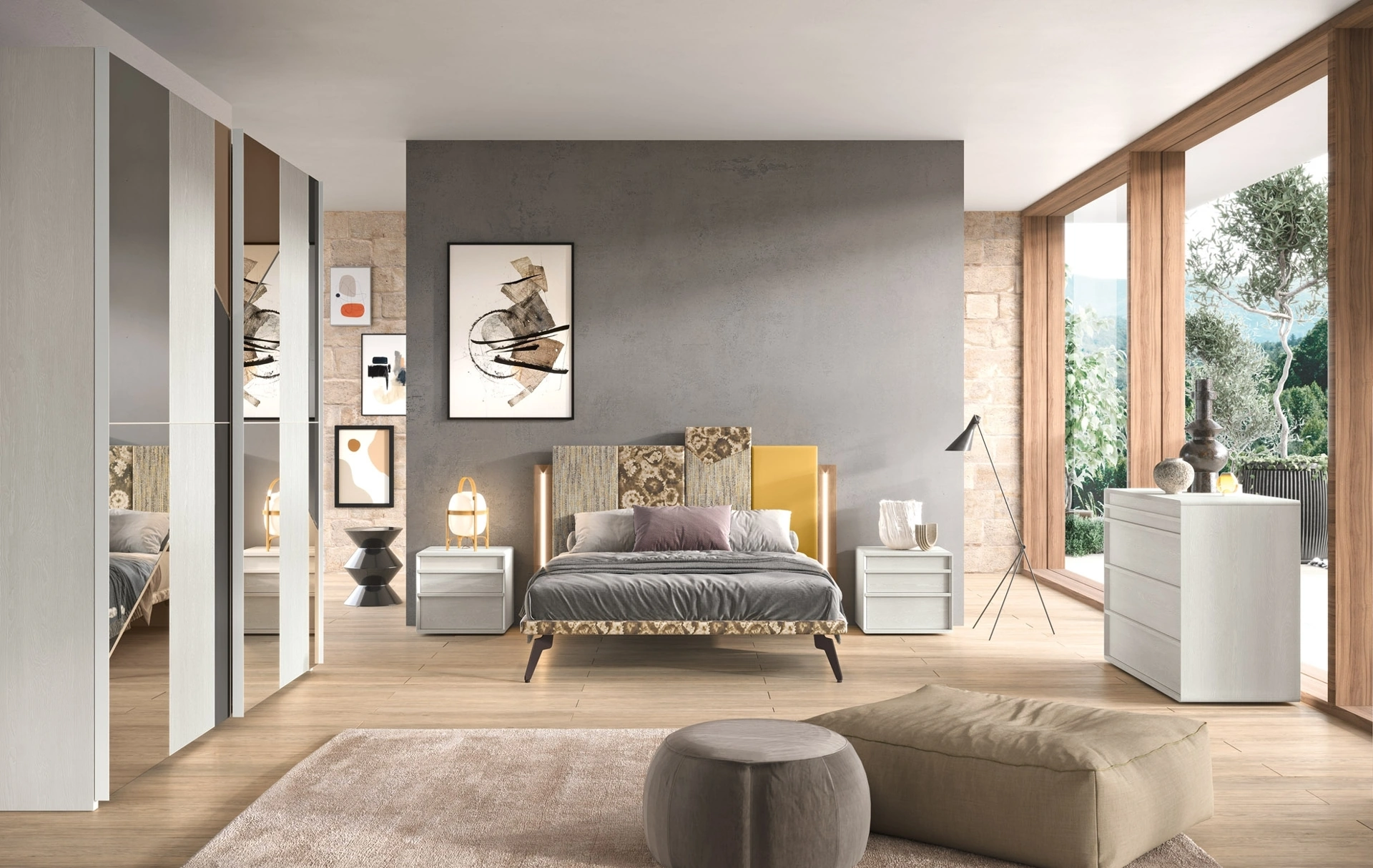Se desideri letti matrimoniali imbottiti, eccoti il modello Composizione 03 in tessuto per valorizzare la camera da letto.