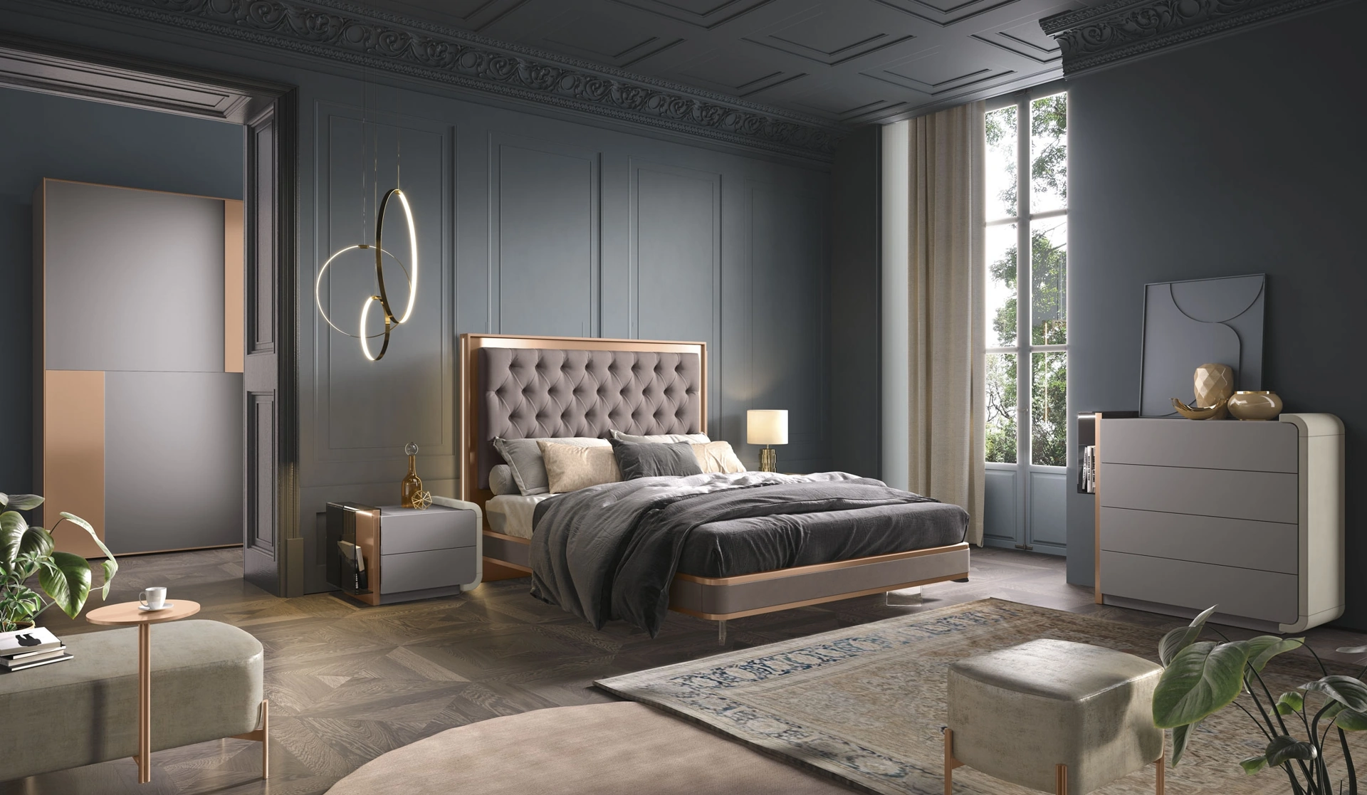 Se desideri letti matrimoniali imbottiti, eccoti il modello Pasitea Trapuntato in tessuto per completare la zona notte.