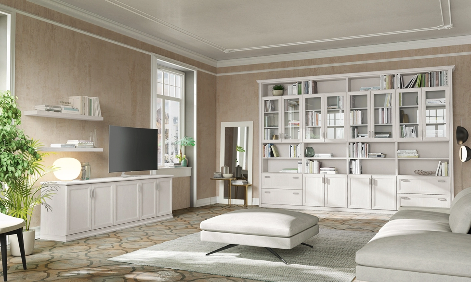 Texture di pregio e linee decise: scopri la libreria Arcadia AS017 di Colombini Casa tra le più originali Librerie classiche a muro.