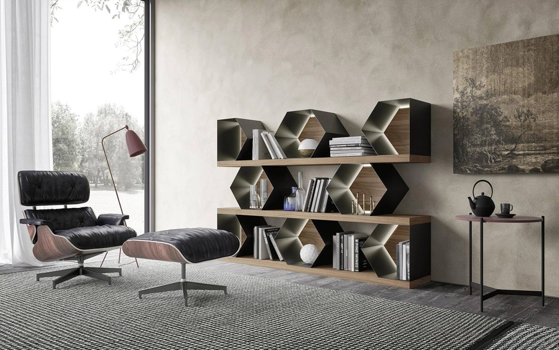 Vuoi rinnovare la zona giorno? Ottieni informazioni sulle librerie design a muro e arreda i tuoi locali con il modello Horizon Esagoni 977.
