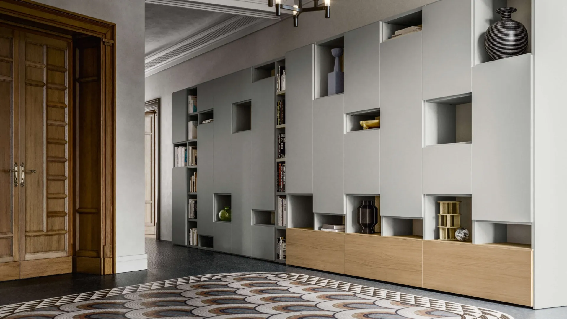 Texture di pregio e forme decise: scopri la libreria Location 09 di SantaLucia tra le più belle Librerie design a muro.