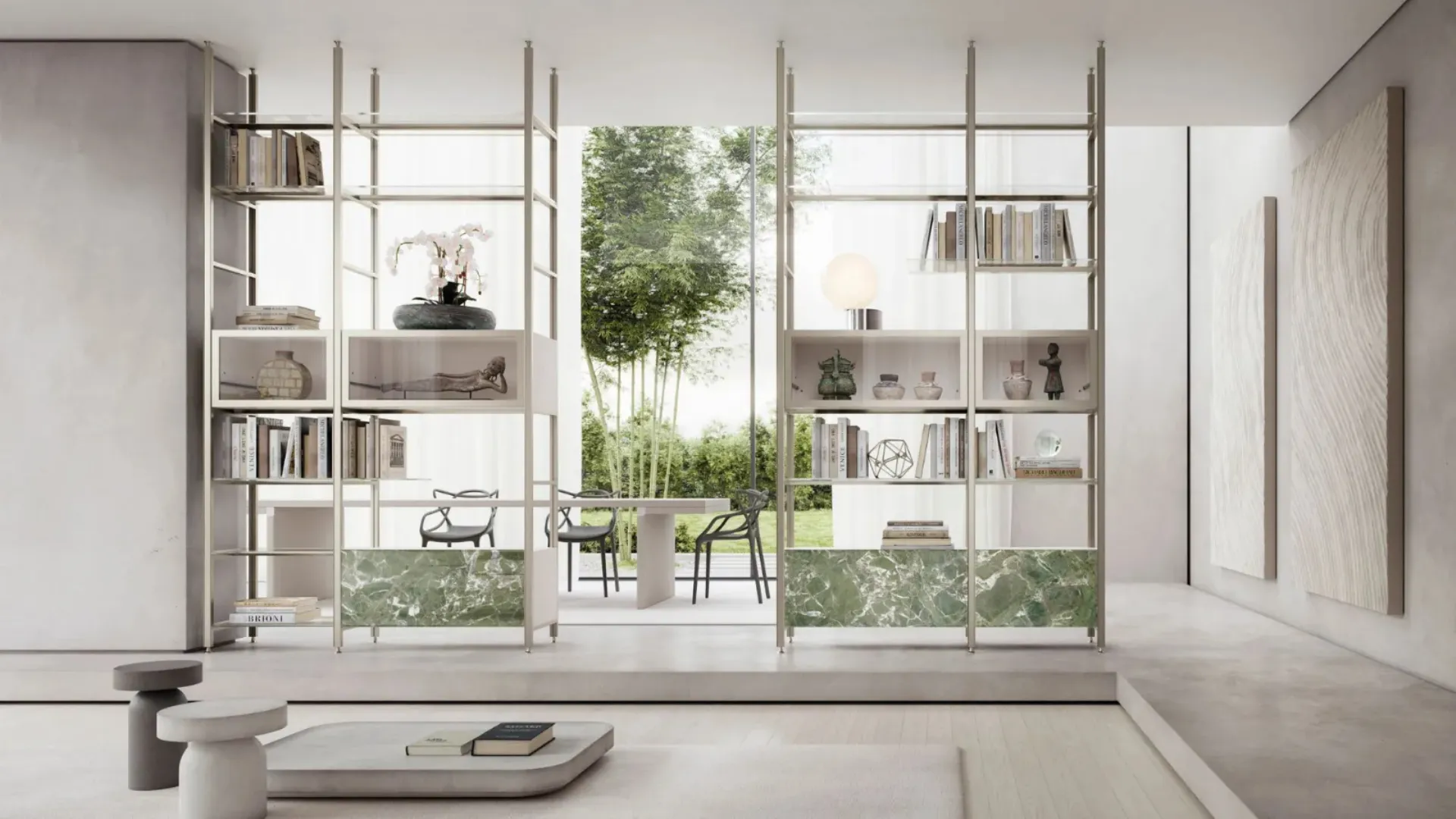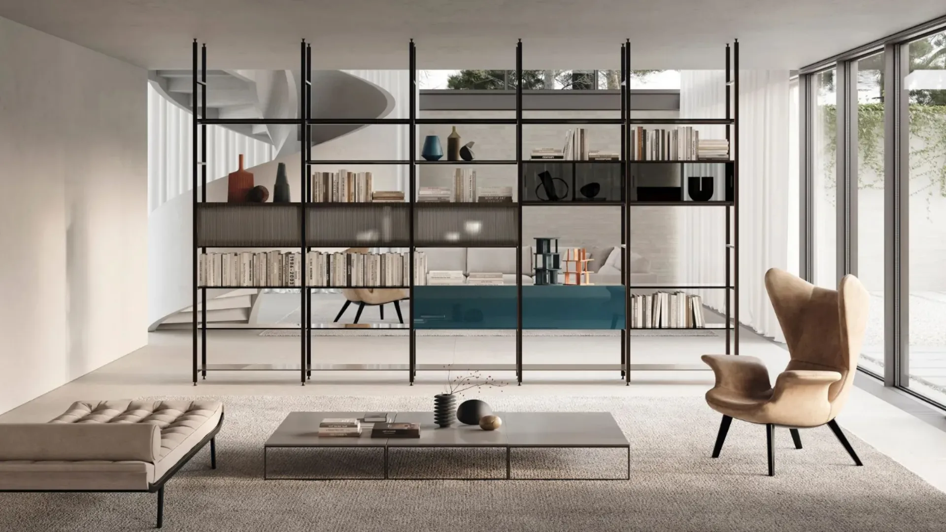Materiali di pregio e forme decise: scopri la libreria Mida a soffitto divisoria di Doal tra le più originali Librerie moderne divisorie.