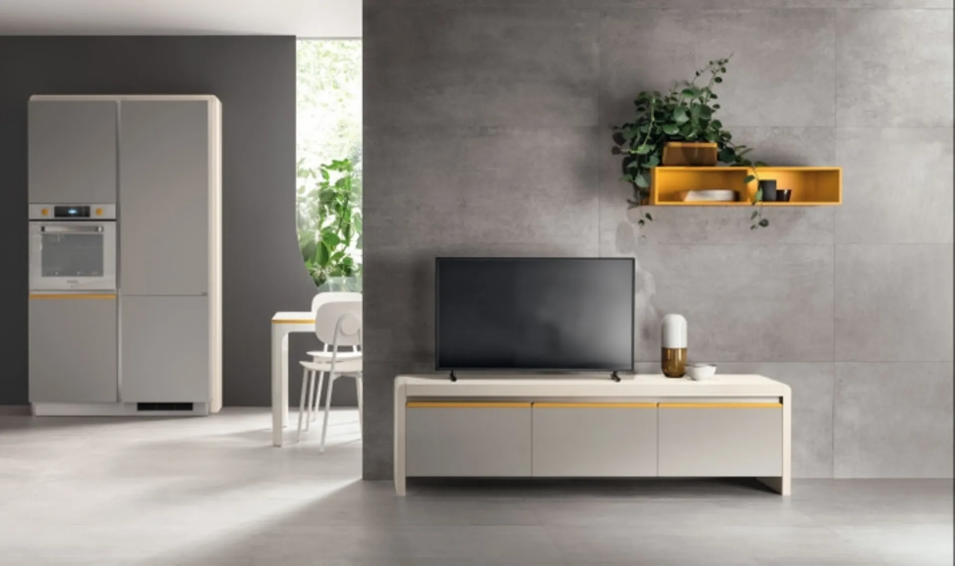 Cerchi una nuova madia bella e funzionale dalle linee moderne? Ti presentiamo il modello Living Dandy Plus Grigio Velo e Giallo senape di Scavolini, realizzato in melaminico.