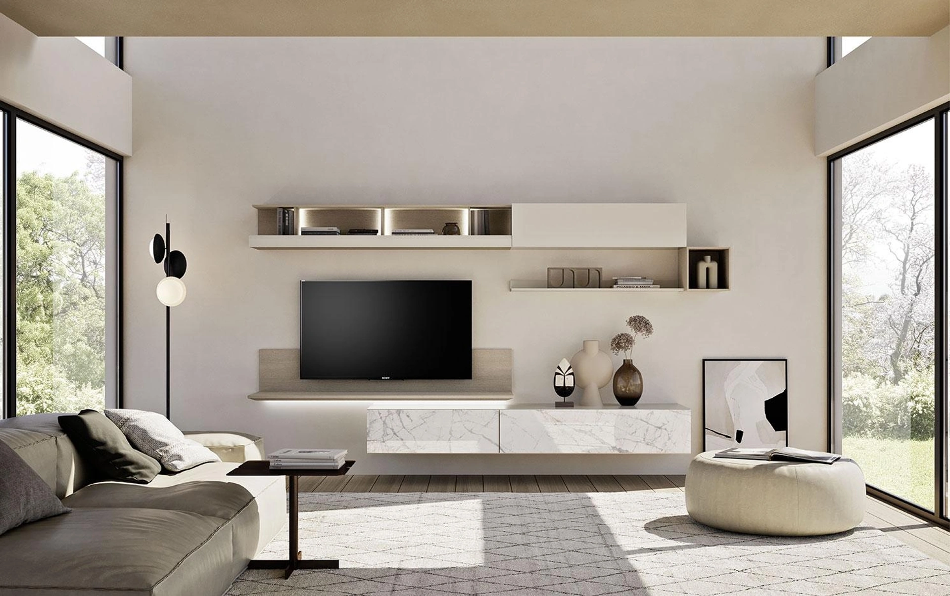 Se vuoi ultimare un living dinamico e operativo dalle linee moderne, ti offriamo la parete attrezzata Composizione Horizon 1015 Mobilgam.