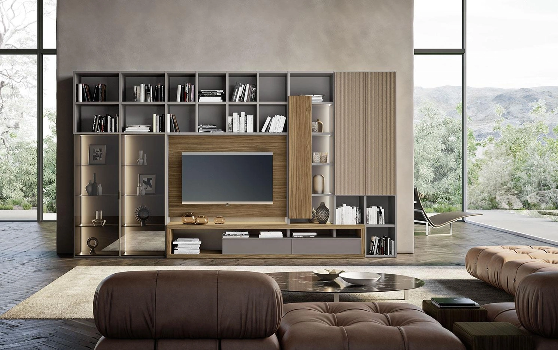 Vuoi progettare un soggiorno pratico e operativo? Ti presentiamo la parete attrezzata Composizione Horizon 1022 Mobilgam dalle forme decise moderne.