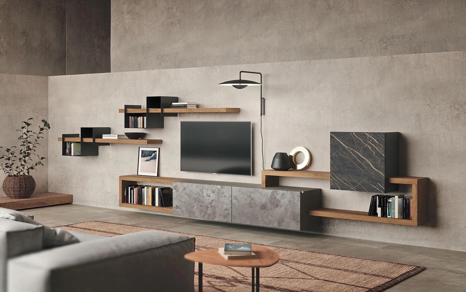 Vuoi allestire un soggiorno pratico e operativo? Ti offriamo la parete attrezzata Composizione Horizon 928 Mobilgam dalle forme decise moderne.