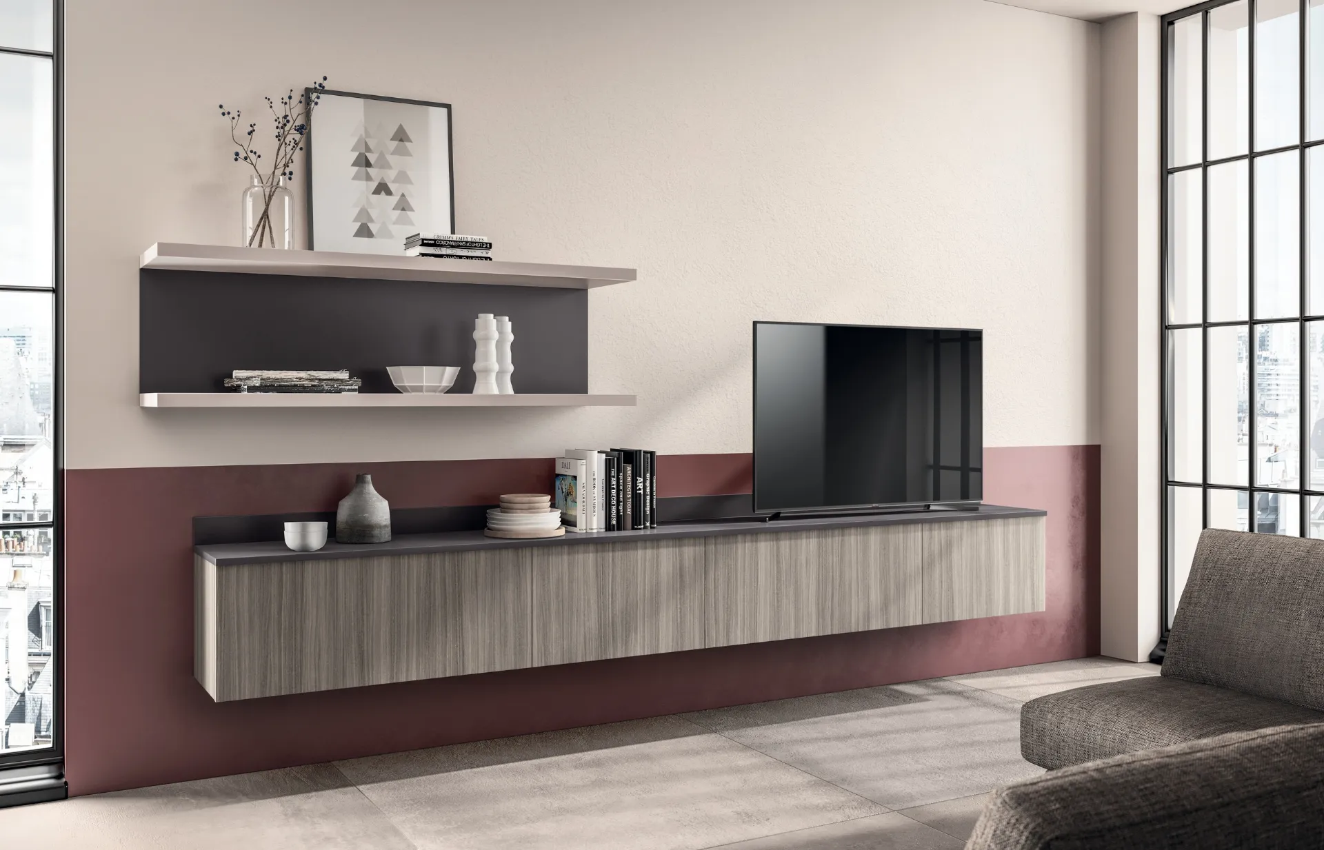 Attraverso un gioco dinamico di accostamenti fra componenti a giorno o vani chiusi, le Pareti Attrezzate moderne arredano il soggiorno valorizzando ogni spazio. Le Pareti Attrezzate hanno acquisito un posto di primo piano nella zona giorno delle nostre case: sono mobili multifunzionali e salvaspazio sempre realizzabili su misura. Per informazioni e preventivi sulla Parete Attrezzata sospesa Living Easy Urban in decorativo Eucalipto Taj di Scavolini in foto contattaci! Il modello proposto è realizzato in melaminico, ma grazie ad un'ampia gamma di finiture, tonalità e conformazioni, potrà adattarsi a stili di ogni tipo. Questa parete attrezzata è una delle soluzioni del marchio e ti permetterà di arredare il soggiorno secondo le più personali problematiche abitative.