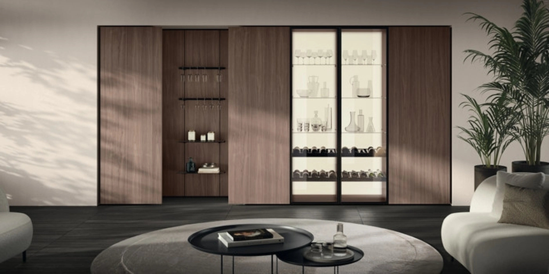 Pareti attrezzate e mobili soggiorno Scavolini: clicca e scopri il modello Living Essenza 02 e potrai arricchire stanze moderne di ogni genere.