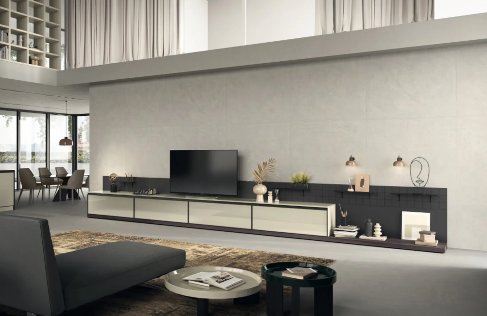 Se desideri completare un soggiorno pratico e operativo dalle linee moderne, ecco a te la parete attrezzata Living Jeometrica 01 Tortora Scavolini.