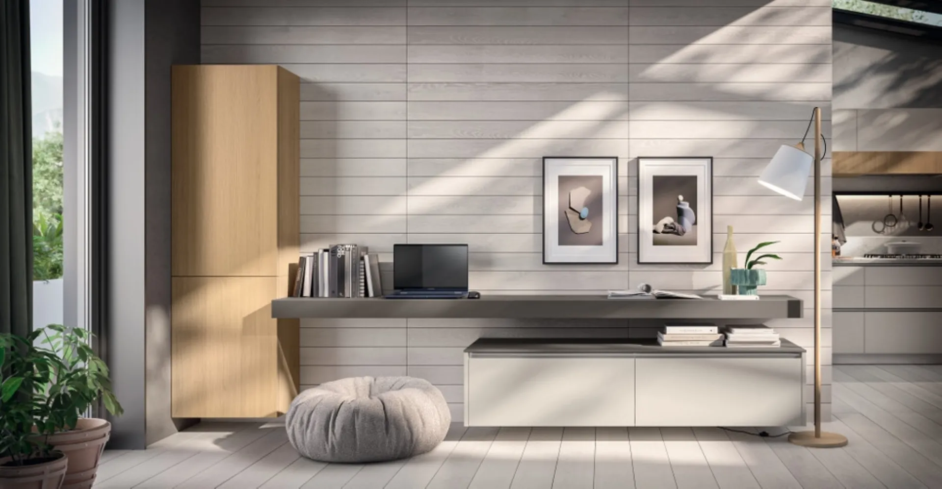 Se vuoi completare un living operativo e pratico dalle linee moderne, ti offriamo la parete attrezzata Living Lumina Home Matter, Rovere Gold e Grigio Londra Scavolini.