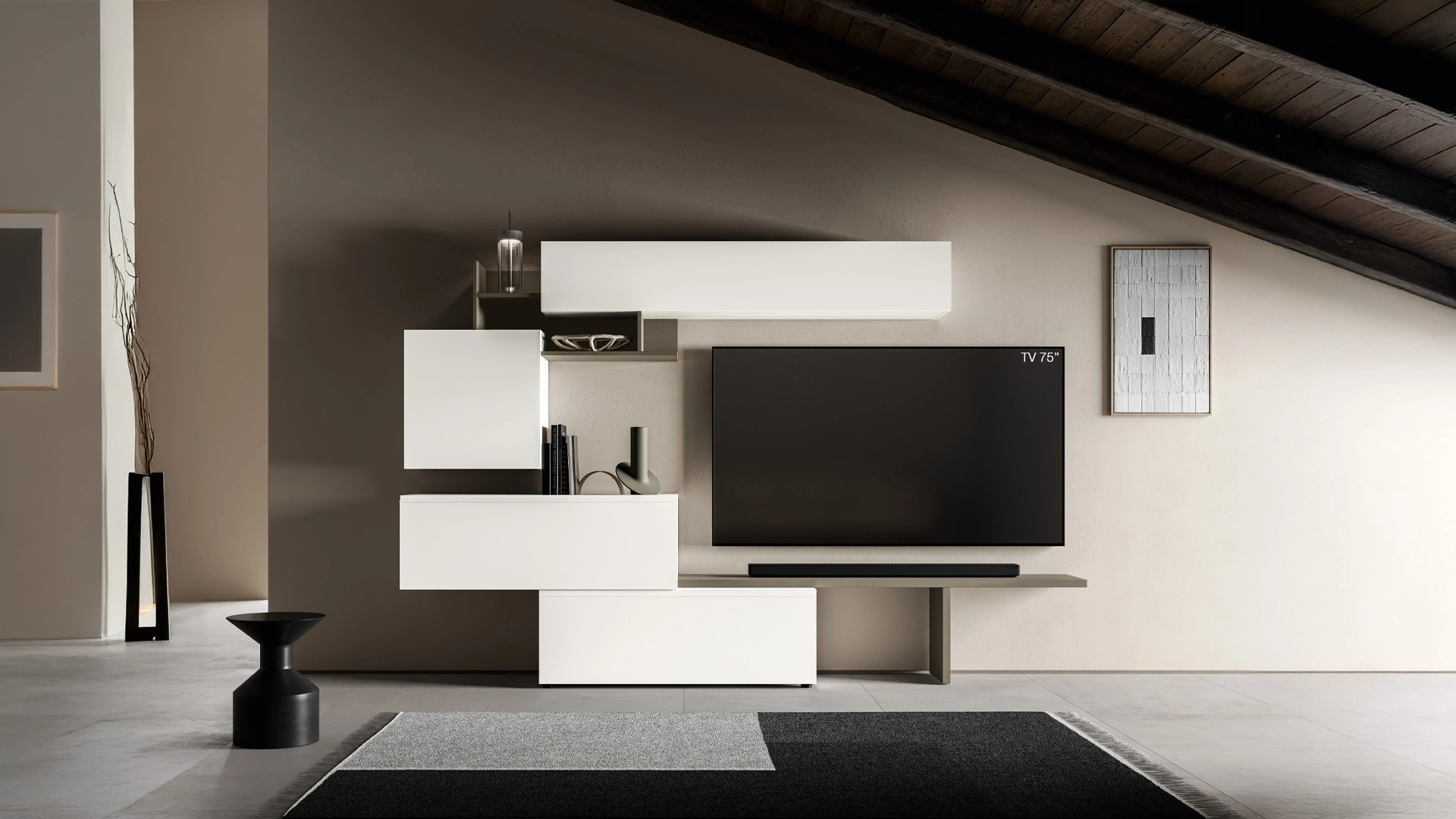 Anche in un living abbastanza piccolo, questo tipo di arredo riesce a organizzare al meglio gli spazi usufruendo al meglio di ogni angolo e assicurando l'alta componibilità tipica delle soluzioni moderne. Questa soluzione costituisce tutta l'eccellenza che il marchio assicura grazie a pluriennale professionalità e grande dedizione nel campo dell'arredo e del design. Un po’ librerie, un po’ contenitori ed espositori: le Pareti Attrezzate sono ideali per sistemare uno spazio pratico e operativo. La Parete Attrezzata Pratico PTG405 di SantaLucia in foto, realizzata in melaminico, risolve le più personali problematiche abitative di spazio e stile senza rinunciare alla ricerca stilistica.