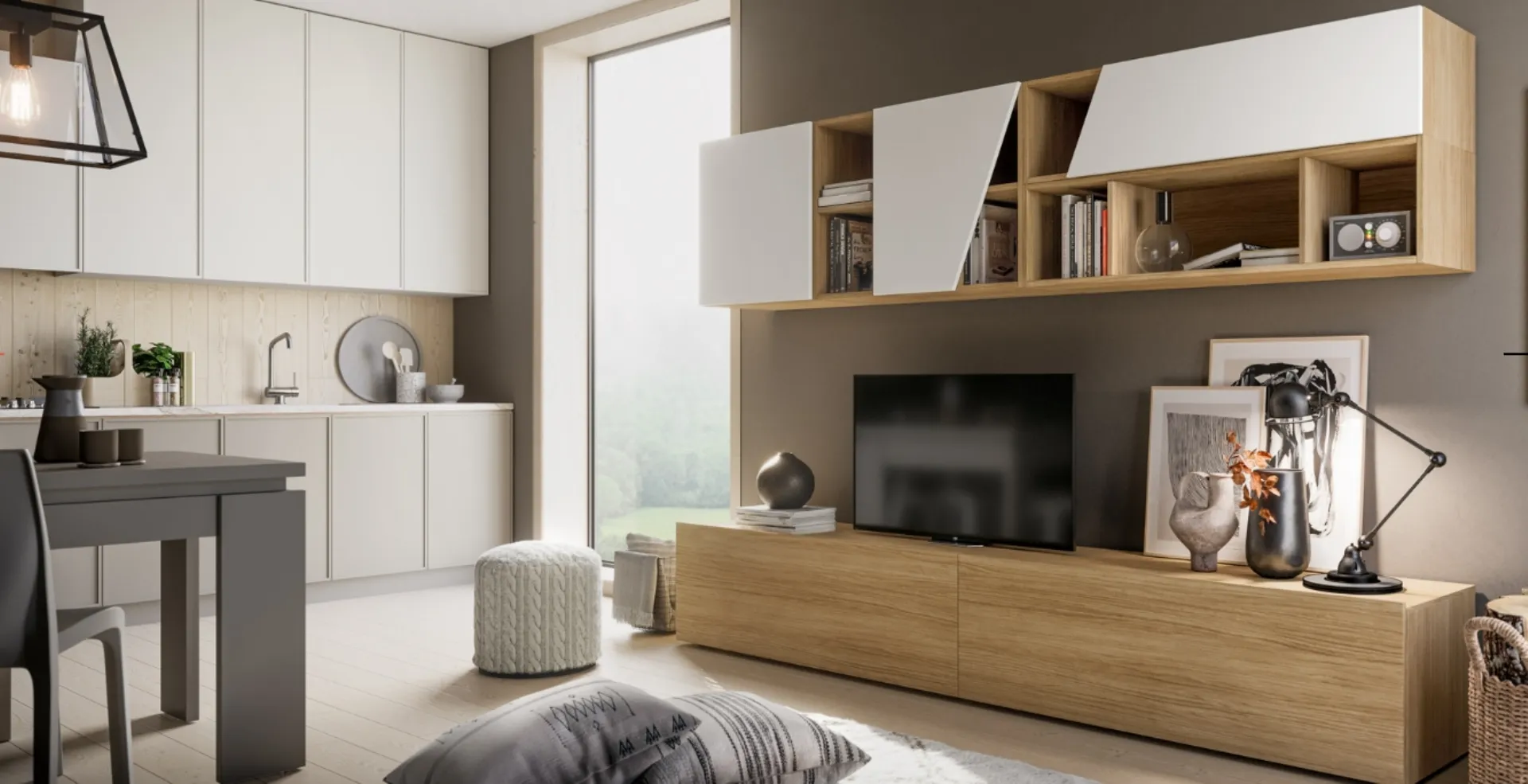 Dato che il living deve essere uno spazio funzionale e bello a vedersi, sono indispensabili alcuni arredi belli e funzionali come le Pareti Attrezzate. Lasciati stuzzicare da un ricco catalogo di arredi per la zona giorno e troverai la parete attrezzata che fa al caso tuo. SantaLucia mette a disposizione inediti modelli di mobili soggiorno, diversi per stile e conformazioni, texture e componenti: scopri in negozio l'Arredamento Casa dei migliori produttori. I mobili soggiorno in melaminico dalle linee moderne come il modello in foto sono davvero versatili e capaci di progettare il living sfruttando bene ogni angolo. La Parete Attrezzata PTG320 di SantaLucia in foto è una tra le più esclusive soluzioni d’arredo sul mercato: l'alta componibilità e le diverse possibilità di progettazione la rendono pratica e sofisticata.