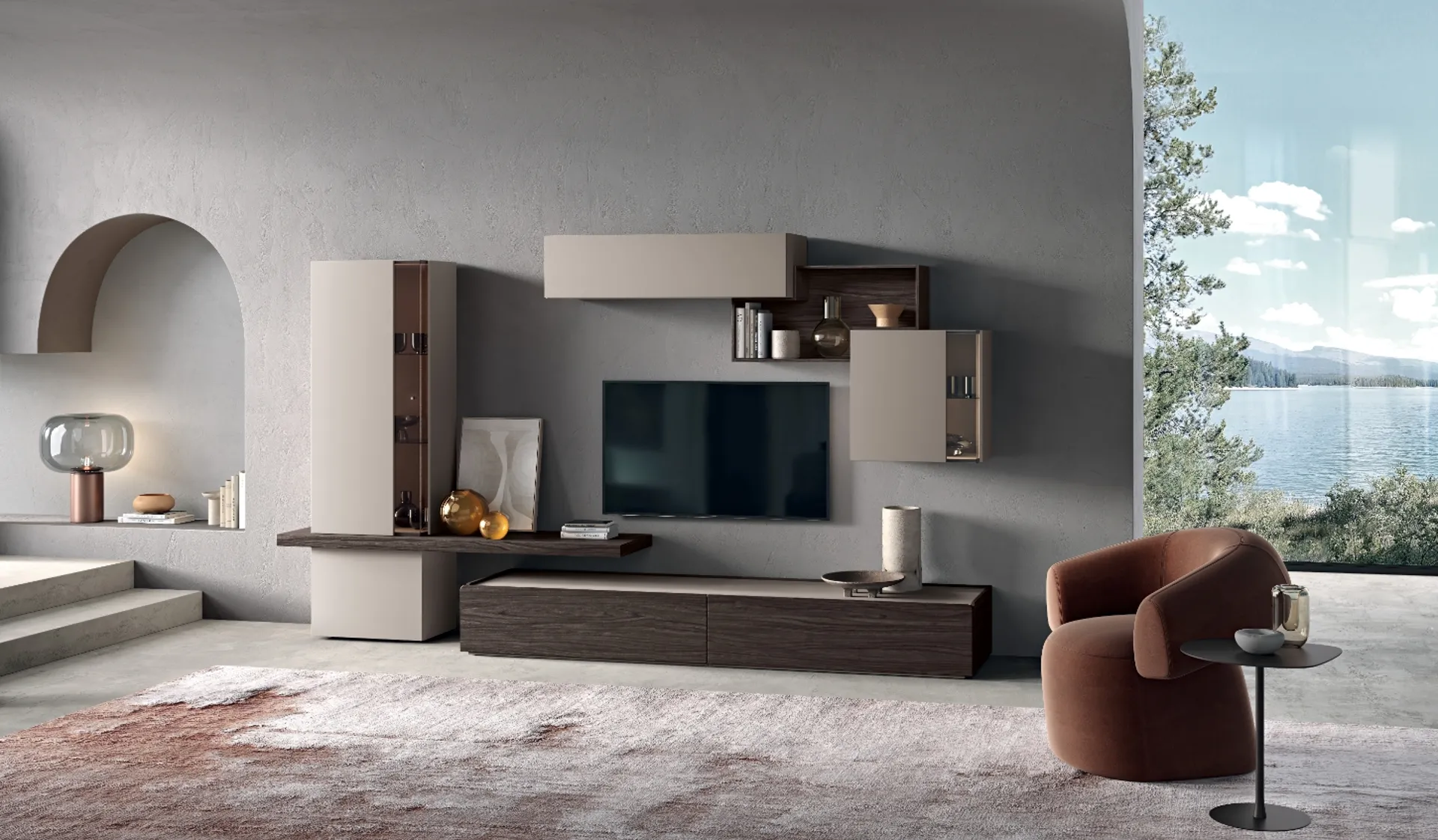 Vuoi arredare un living pratico e operativo? Ti presentiamo la parete attrezzata Sky 05 Spar dalle forme decise moderne.