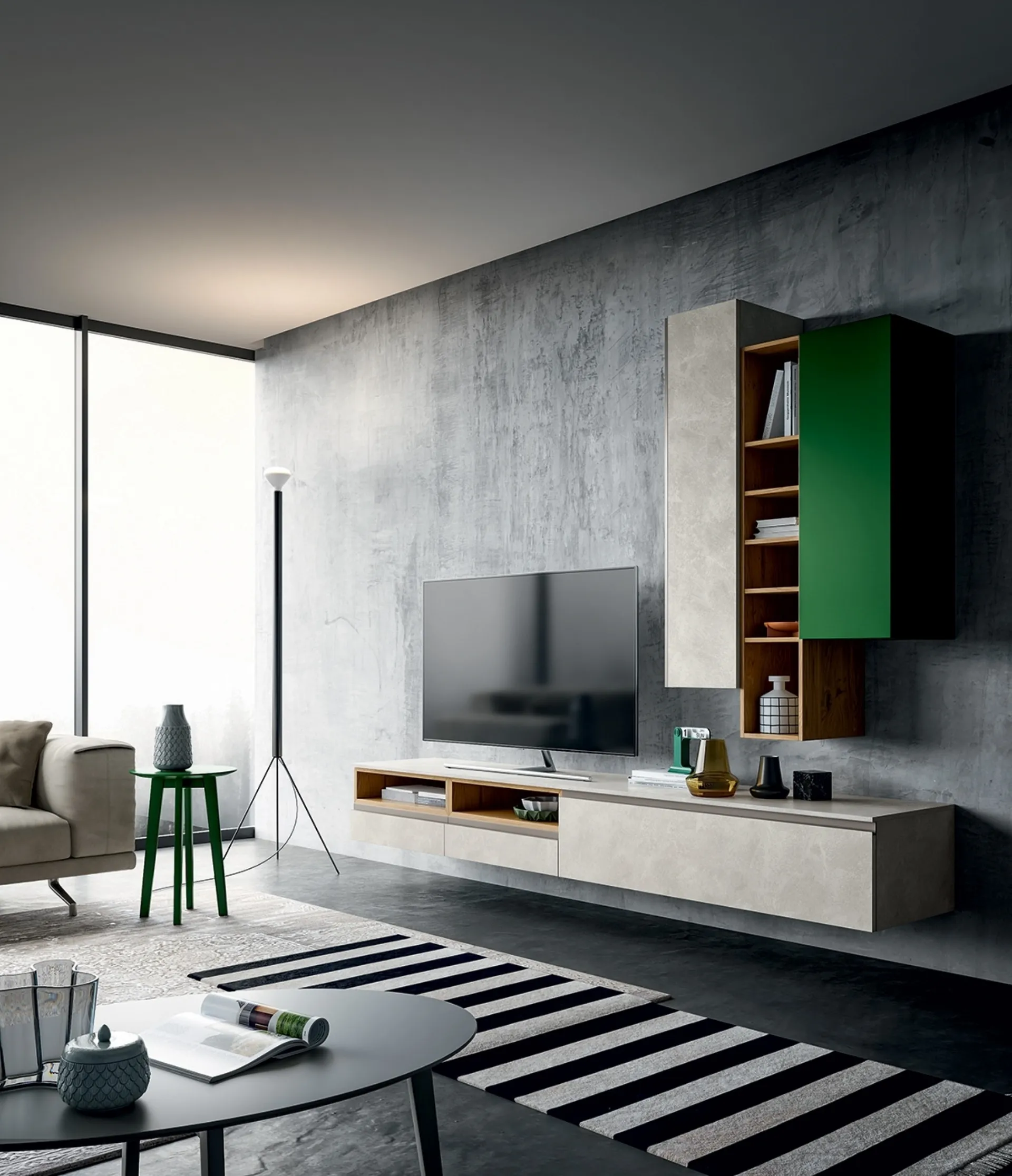 Pareti attrezzate e mobili soggiorno Dall'Agnese: clicca e scopri il modello Slim Up Comp 01 in effetto Resina Tortora e Verde Foglia e potrai impreziosire stanze moderne di ogni tipo.