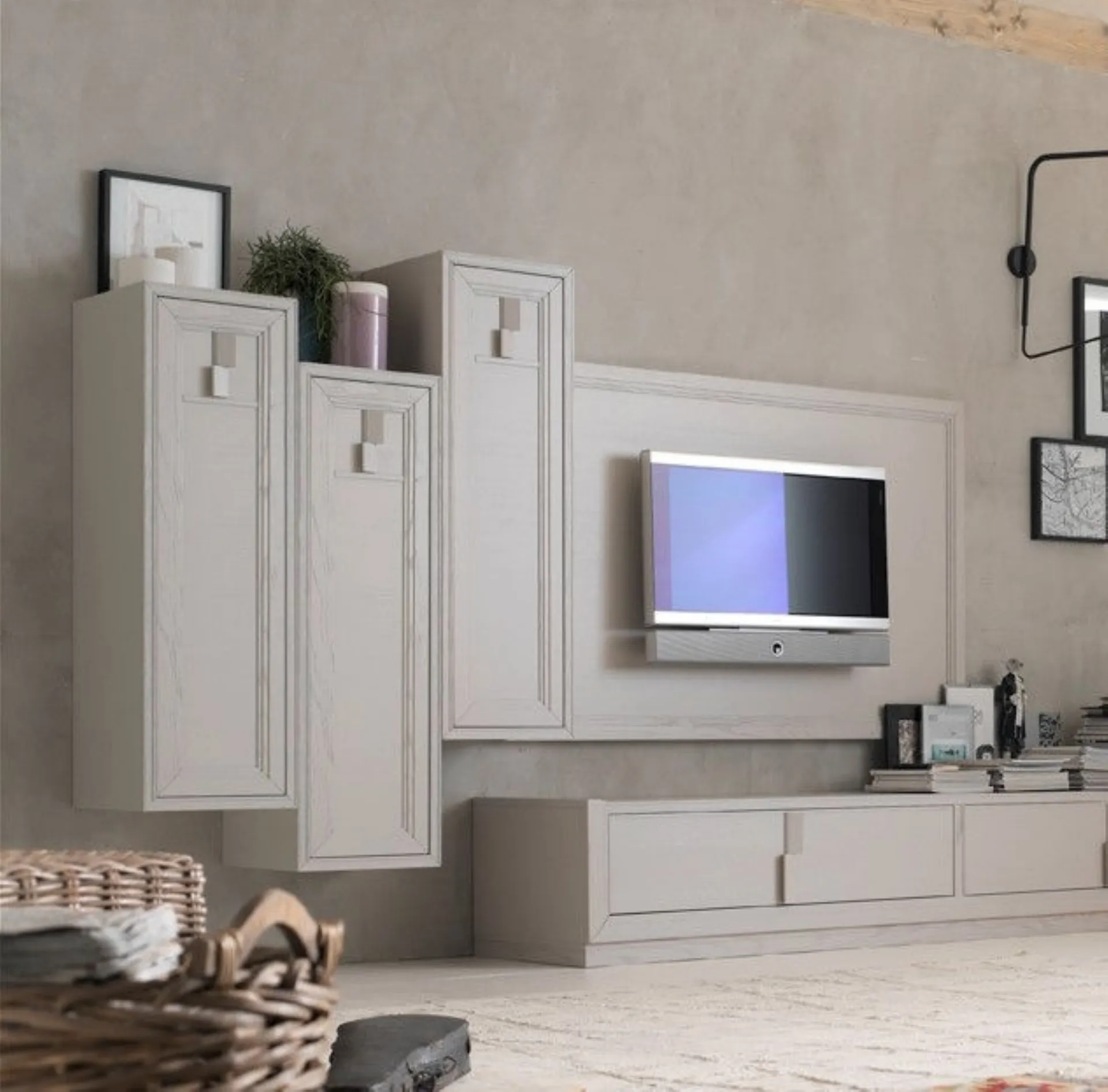 Vuoi progettare un soggiorno dinamico e operativo? Ti offriamo la parete attrezzata Tea T in finitura Madreperla Fasolin dalle forme decise moderne.