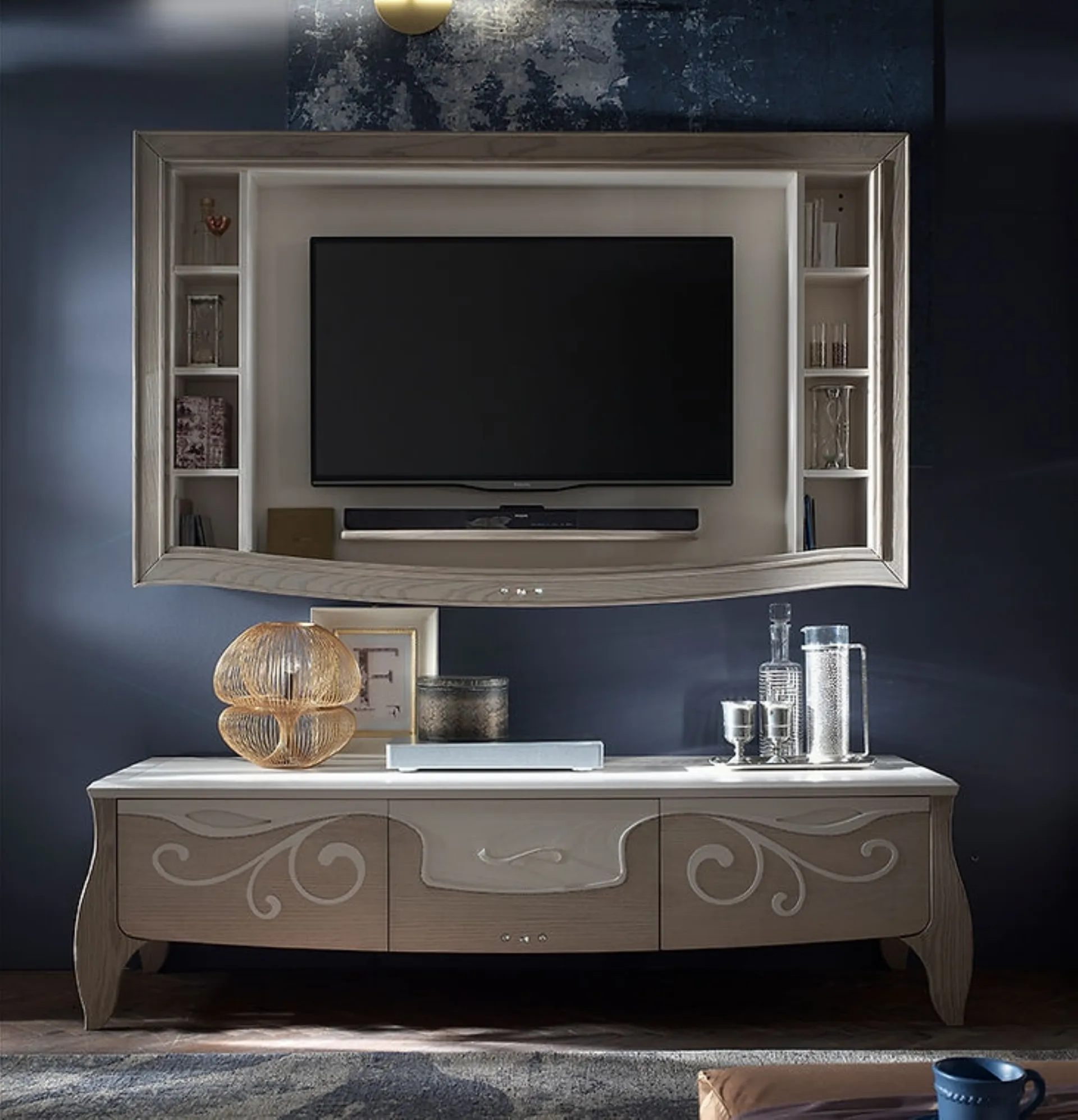 Pareti attrezzate e mobili giorno Fasolin: clicca e scopri il modello Trésor TS3 Cipria e Gesso e potrai completare stanze moderne di ogni tipo.