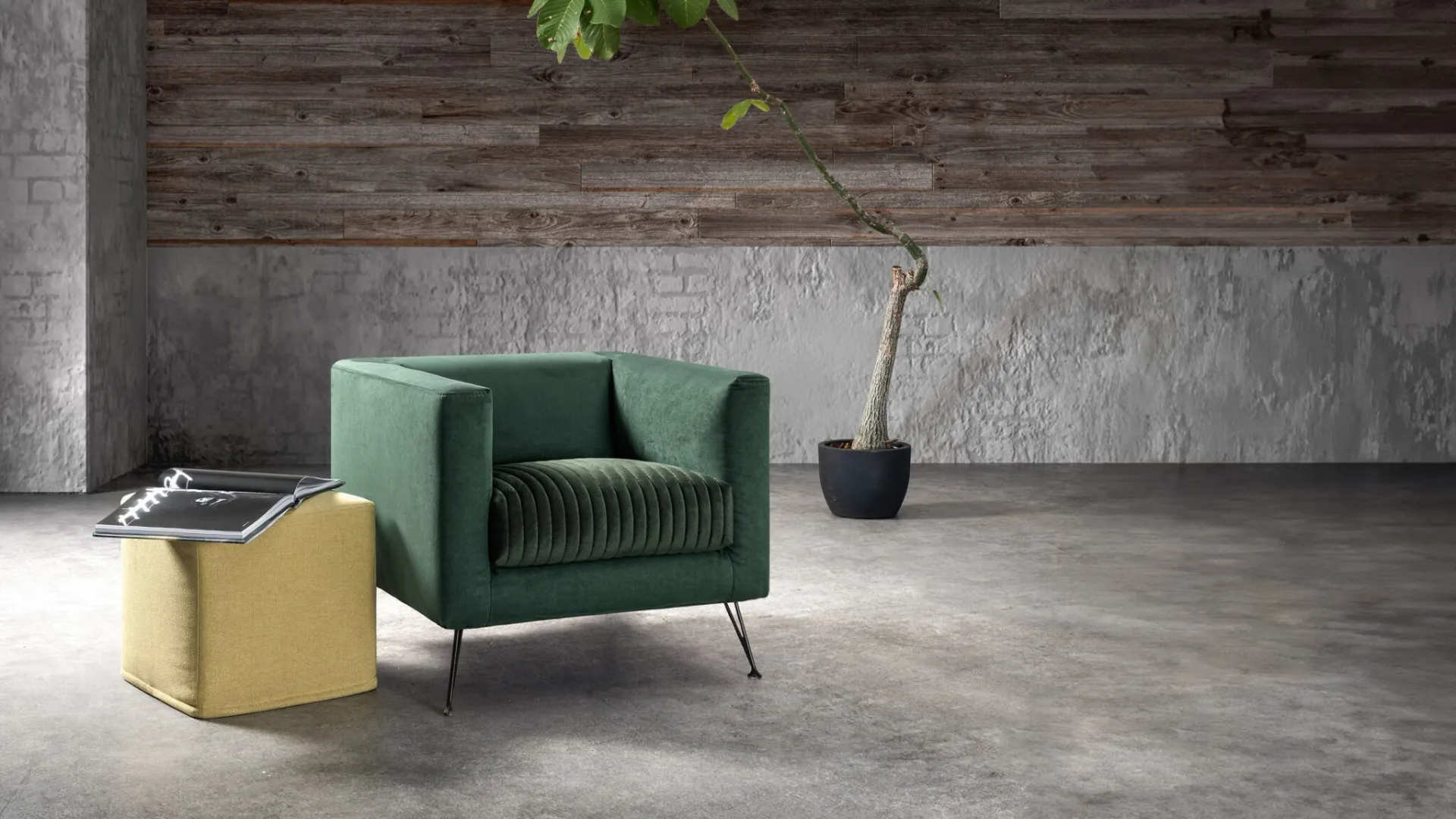 Se vuoi una poltroncina per stanze moderne, clicca e leggi di più sul modello Synthesis in tessuto della marca Samoa.