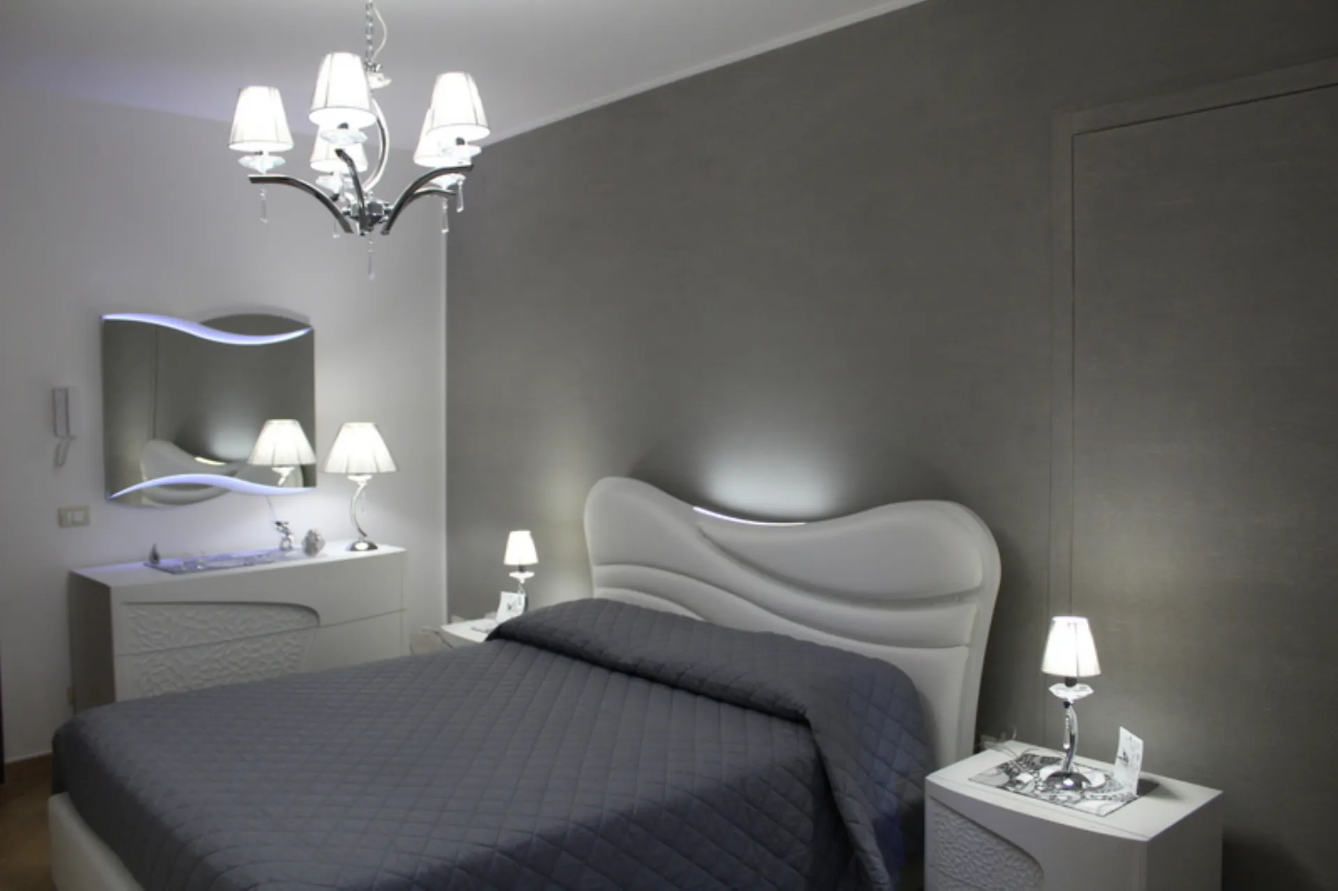 Camera matrimoniale bianca con comodini, comò e armadio coordinati.