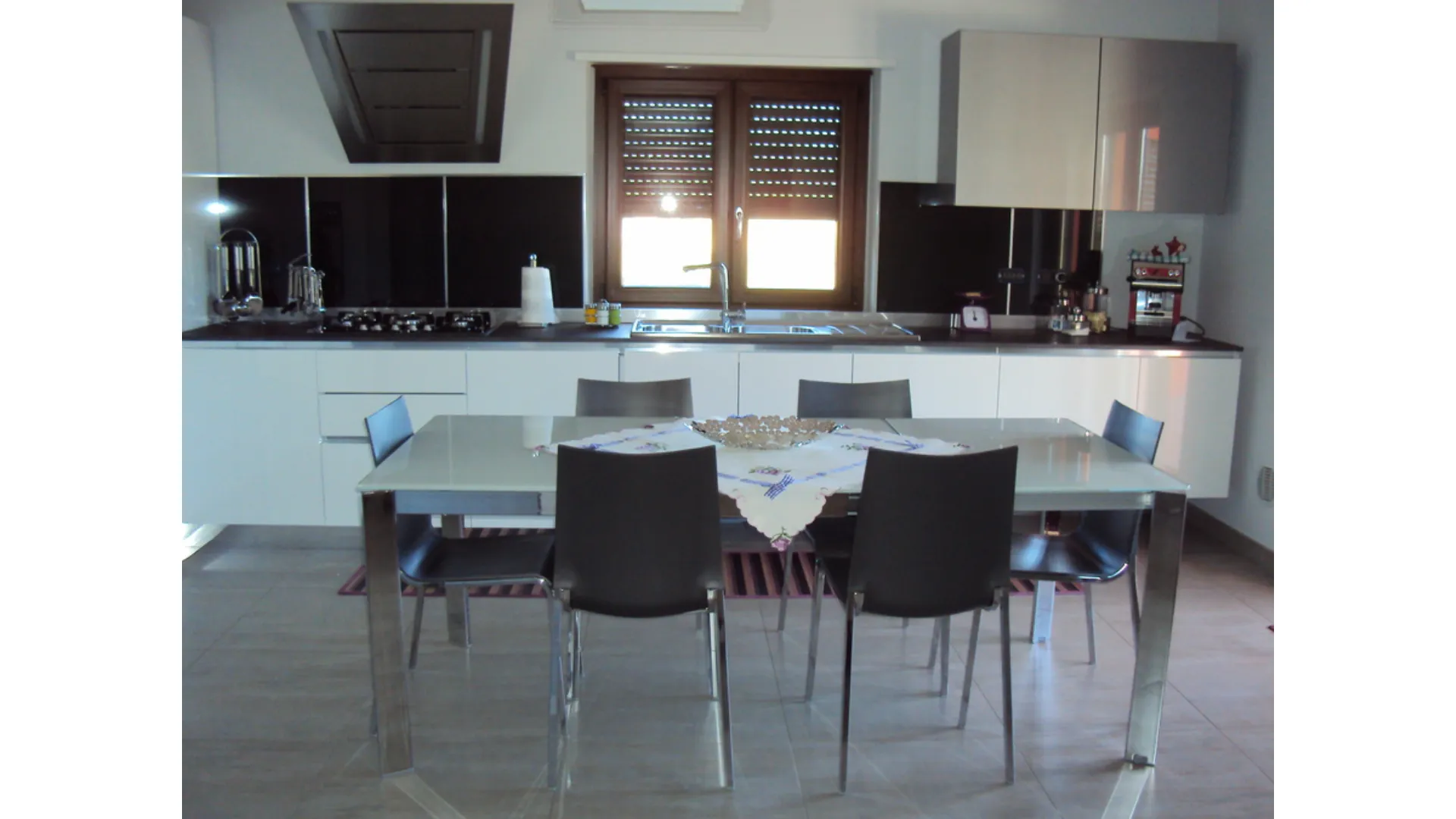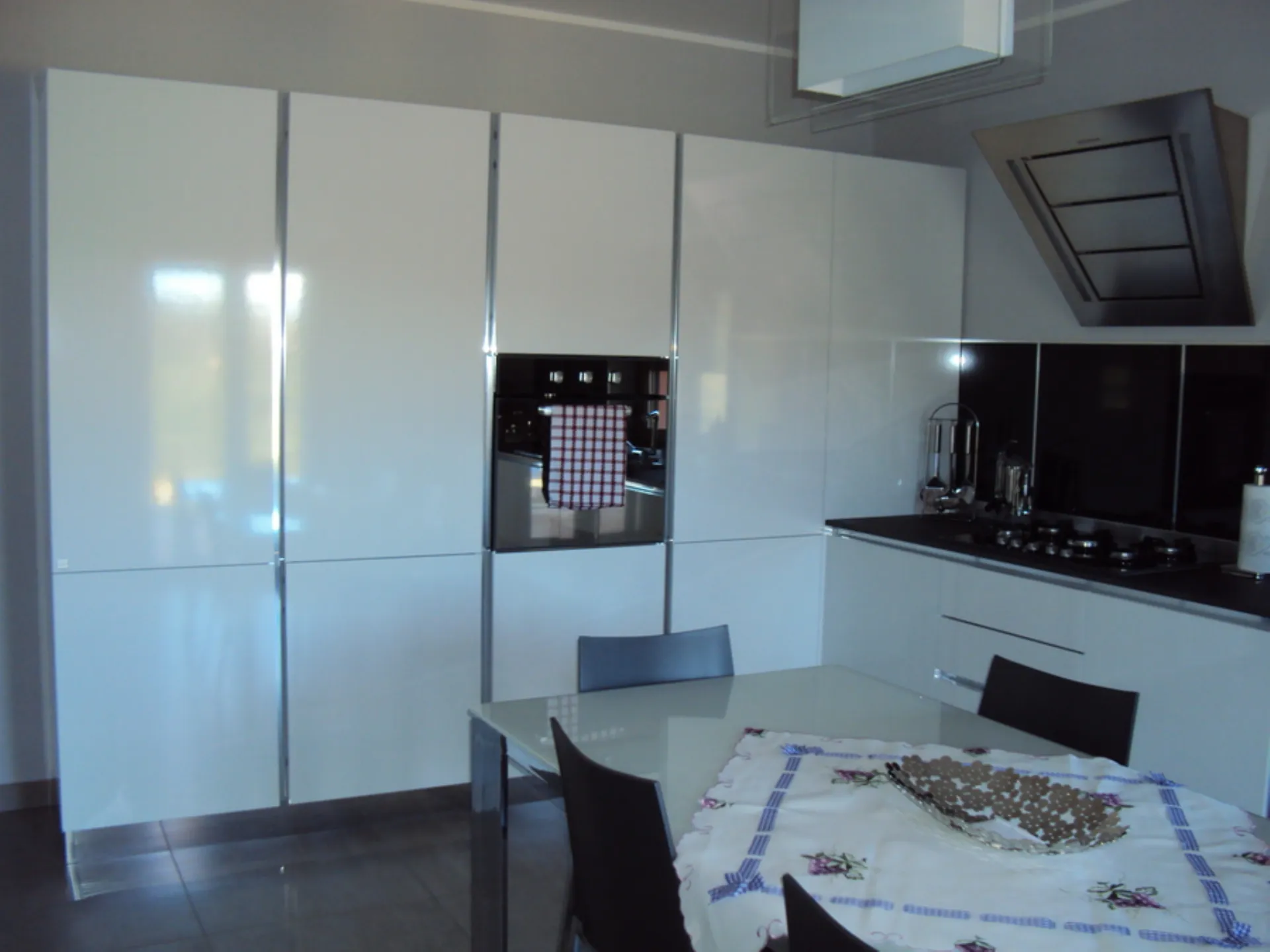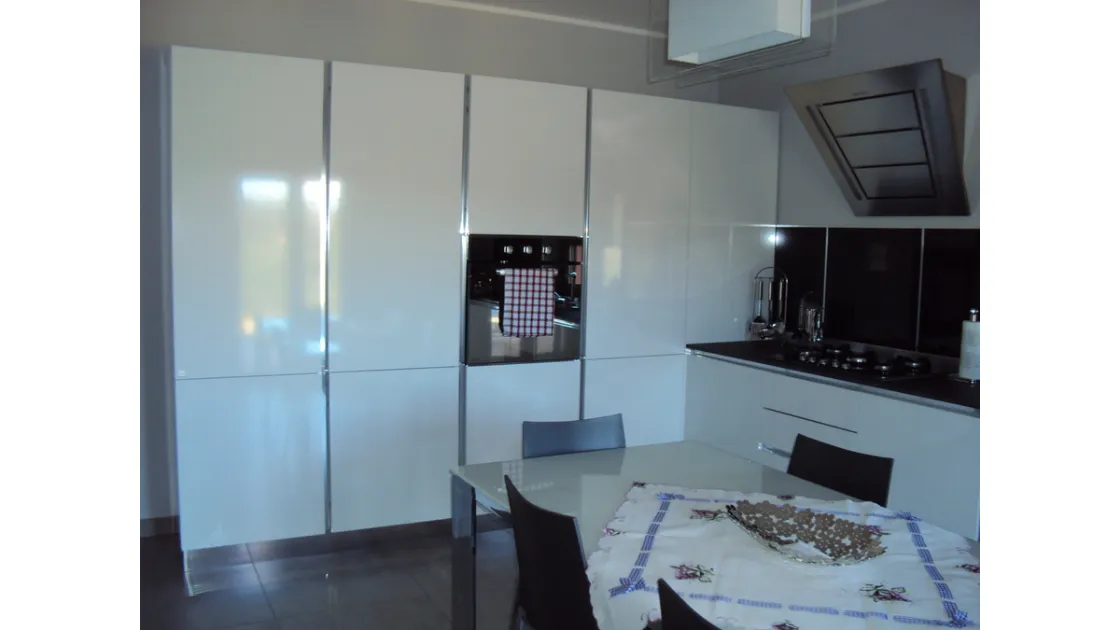 Cucina moderna ad angolo in laccato bianco con paraschizzi a contrasto.