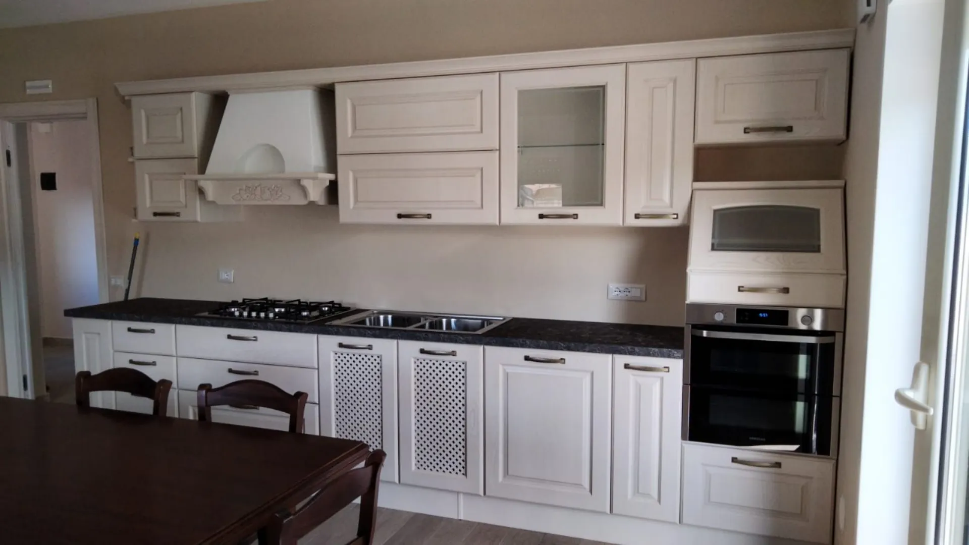 Curata nei minimi dettagli dalla base sottolavello con ante a grate all' elemento porta pane sopra la semi colonna forno.
