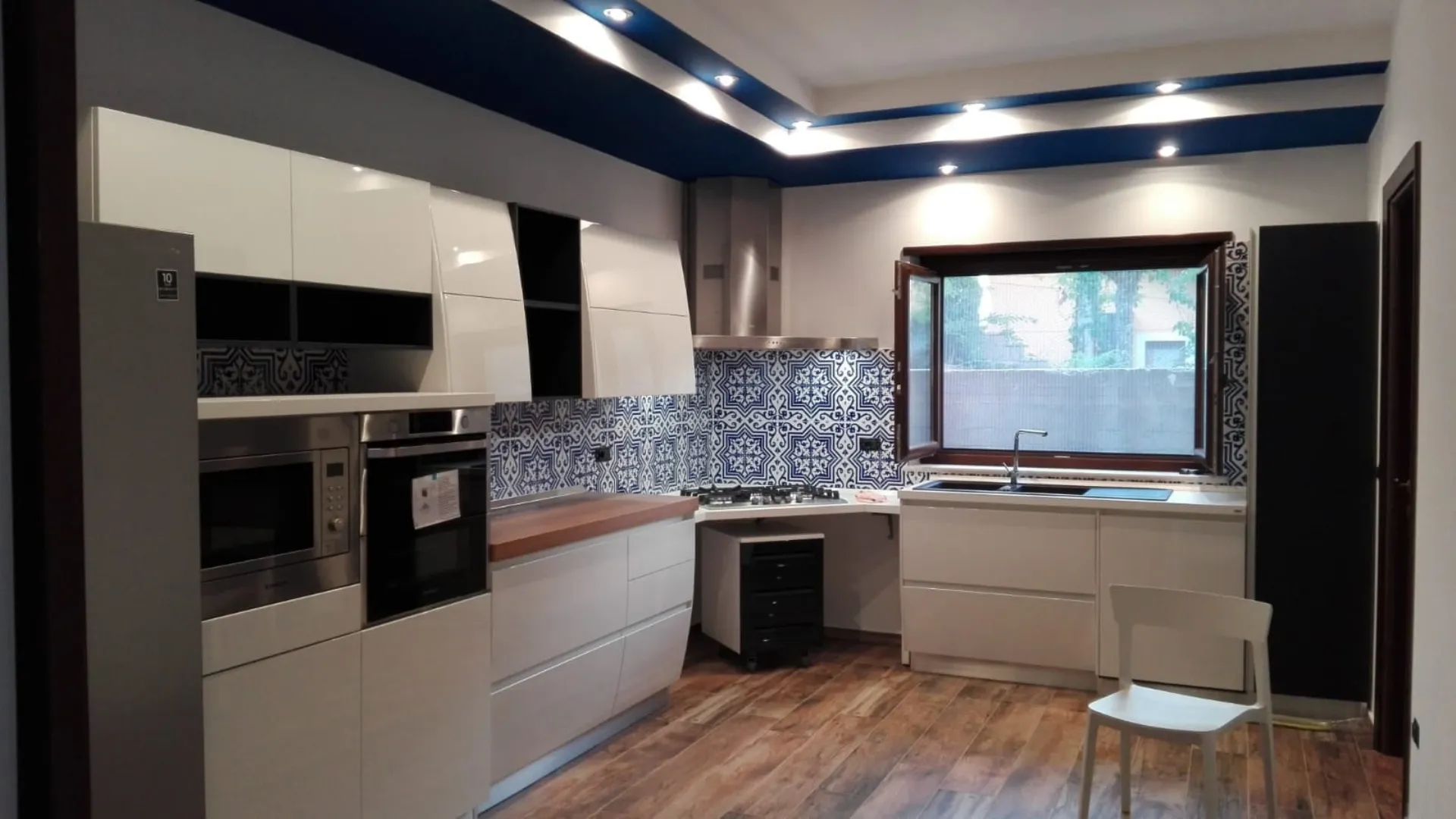 Cucina componibile mod. Flux Swing della Scavolini tutta laccata lucida bianca e dettagli in laccato lucido Blu Moon