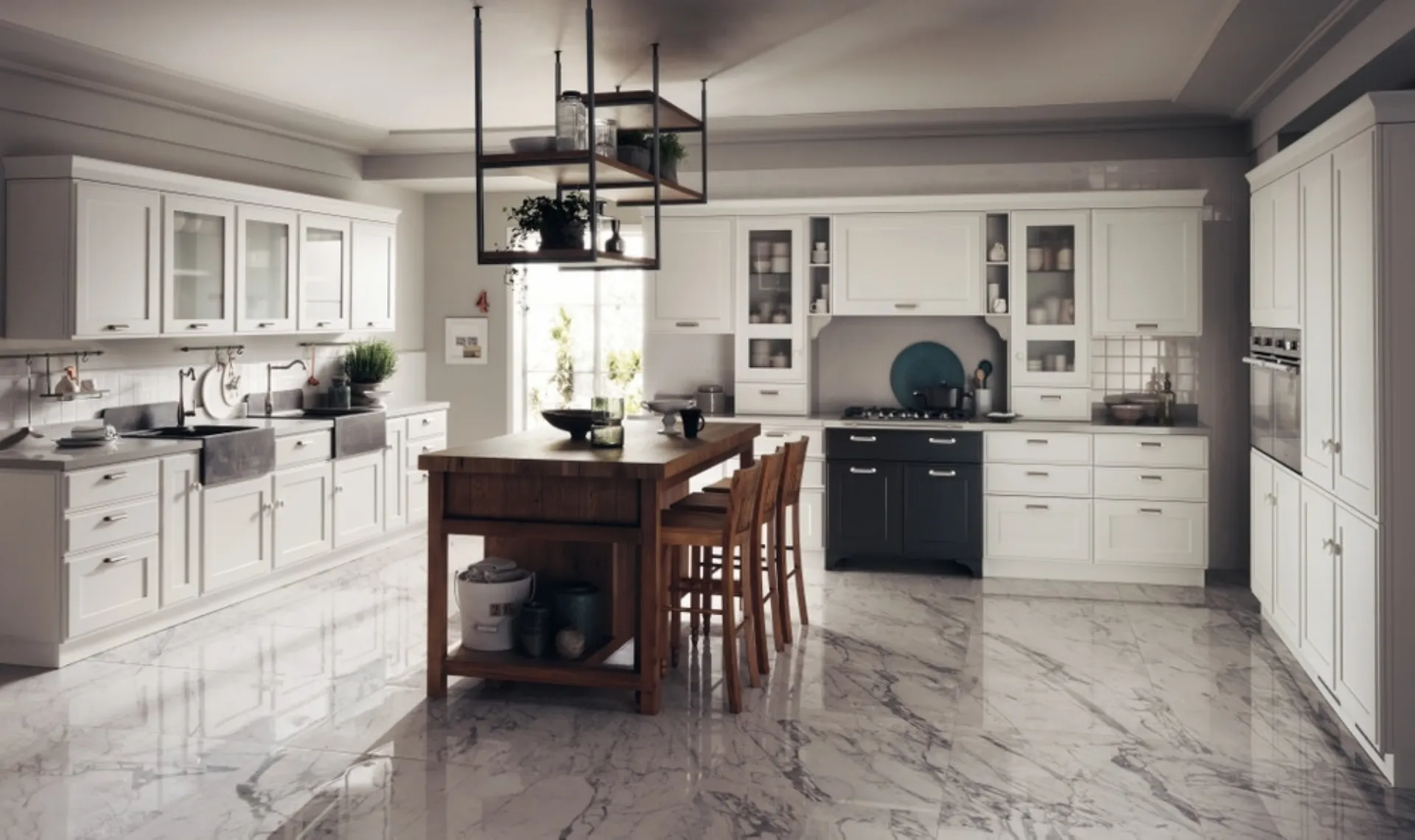 Cucine con isola Scavolini: entra e scopri un mondo di design e contenuto estetico! La cucina classica Favilla 04 con Isola in Rovere Nodato ti sta aspettando.