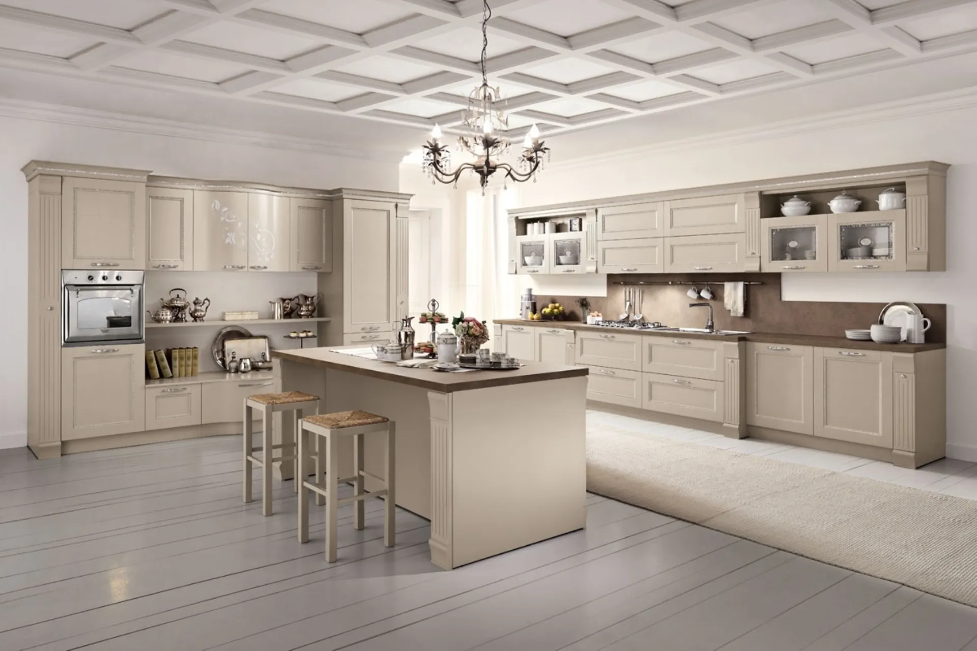 Tempo di organizzare la cucina? Opta per il modello Prestige 20 Spar tra le nostre Cucine Classiche con isola.