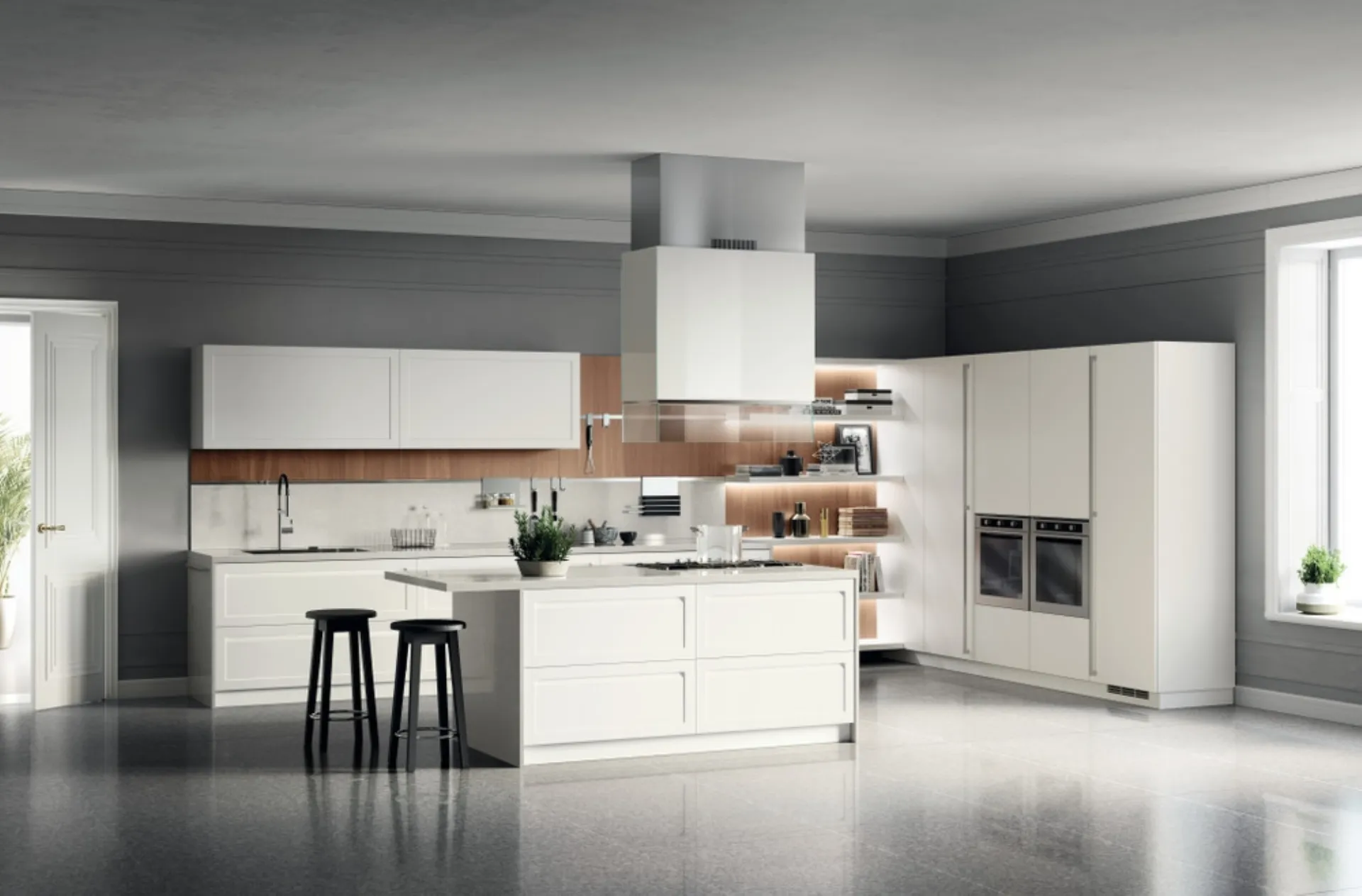 Se desideri una cucina moderna Scavolini, Carattere Bianco Prestige in laccato opaco ti attende nel nostro negozio di Cucine Moderne con isola.