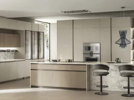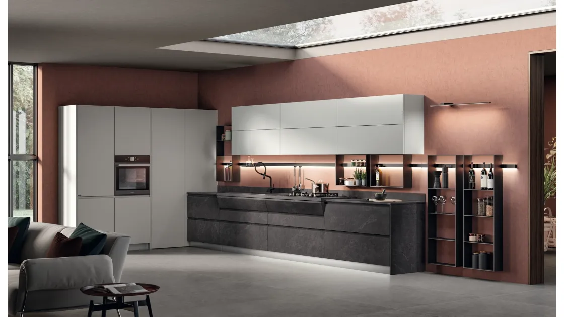 Ottieni informazioni sulla cucina Motus in Pietra Abyss e laccato opaco Grigio Airone di Scavolini: questa soluzione in melaminico sarà la scelta ideale per te!