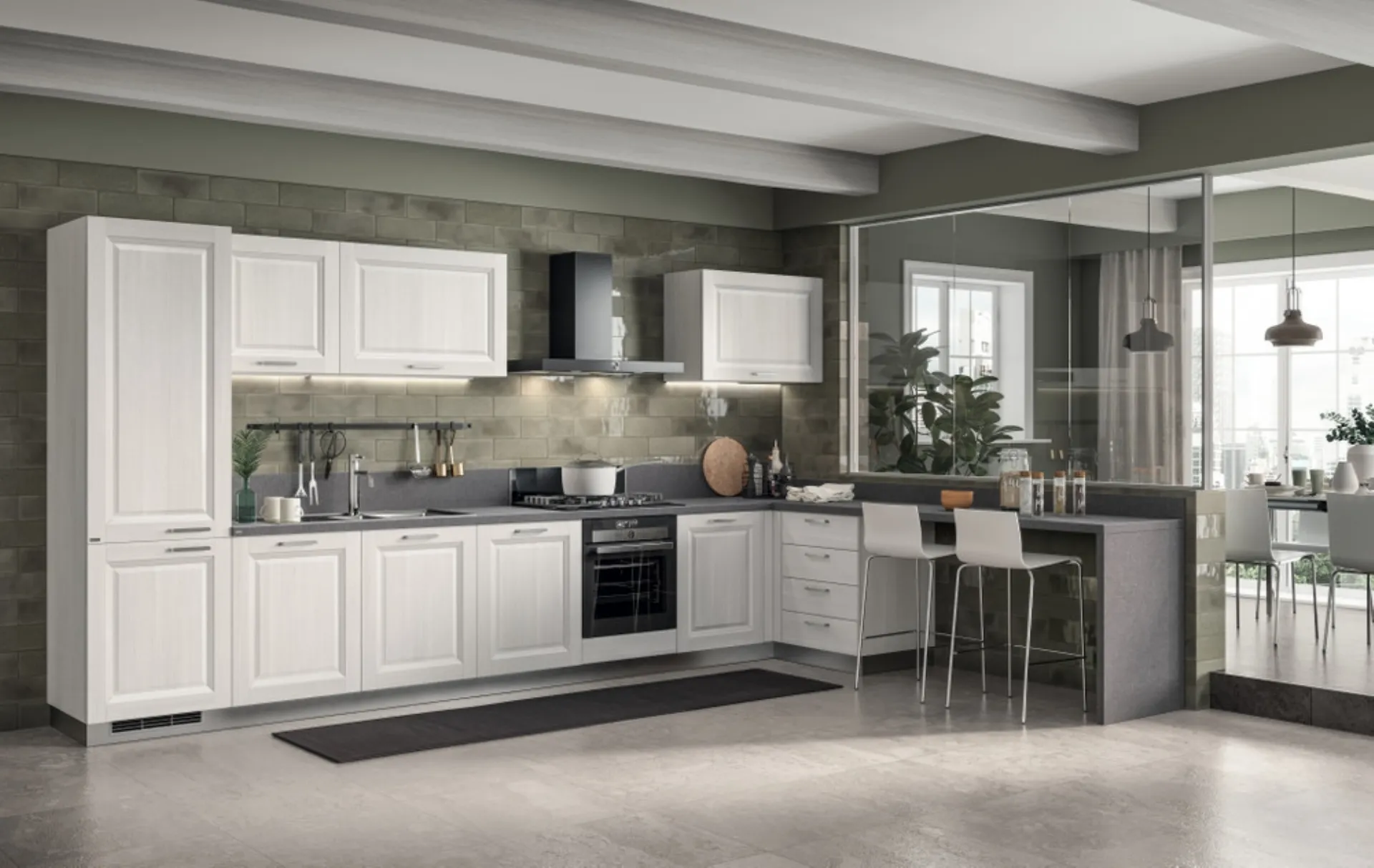 Scopri l'alta componibilità delle Cucine ad angolo Scavolini: la cucina Family decorativo Larice Neve in melaminico ti attende!