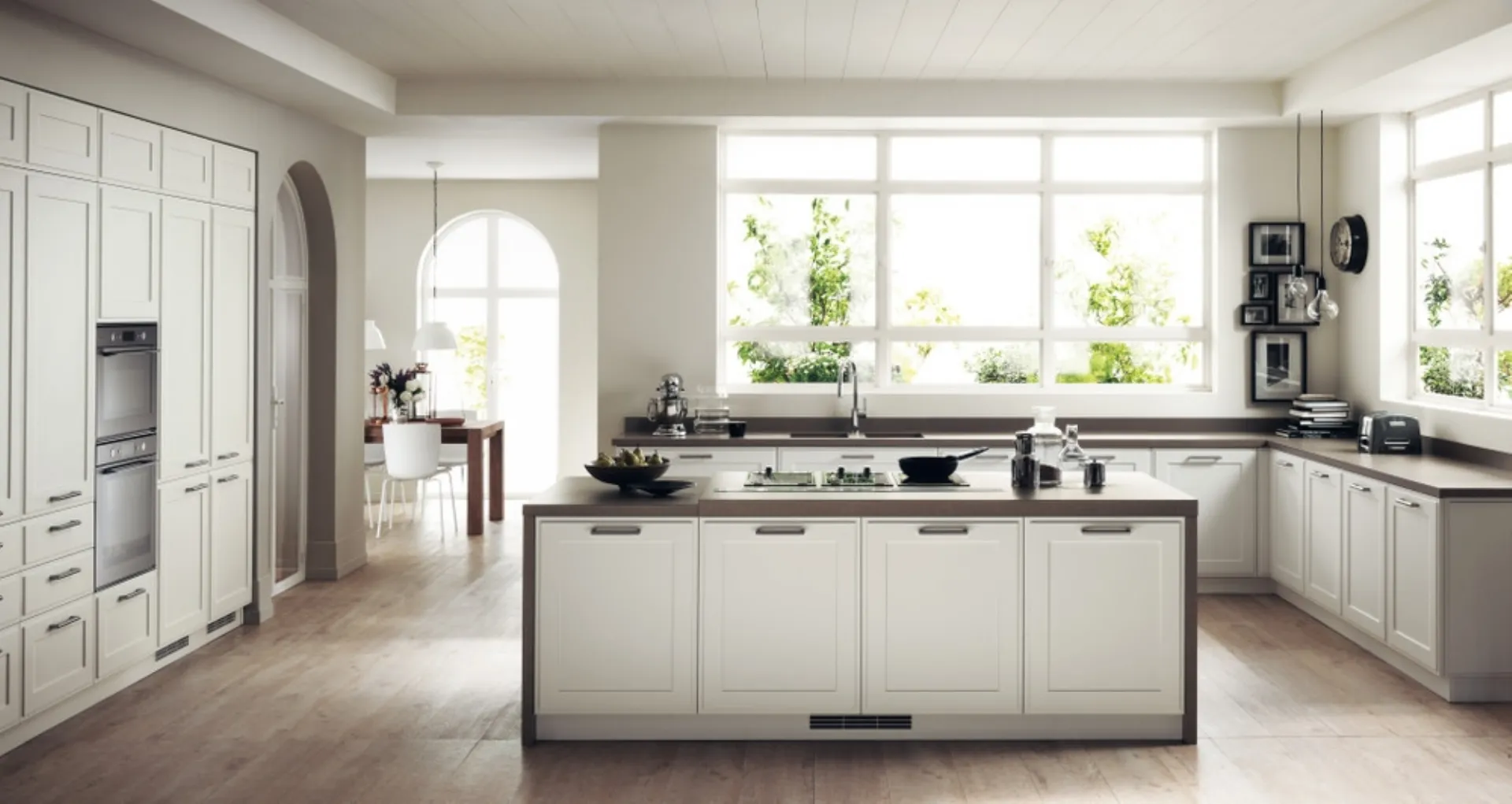 Cucine su misura Scavolini: opta per il modello Favilla 06 Bianco Prestige in laccato opaco tra le nostre soluzioni con isola!