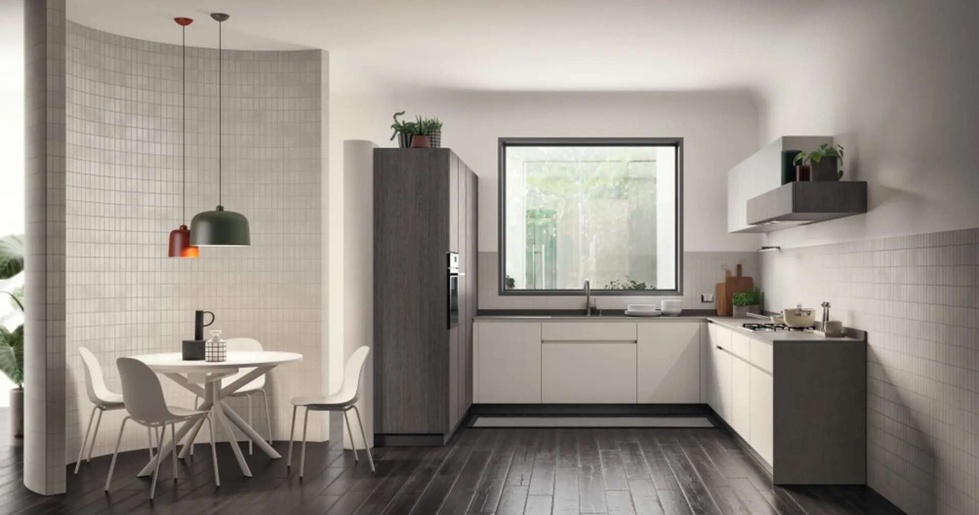 Scopri massima componibilità delle Cucine ad angolo Scavolini: la cucina Libra 05 Bianco Prestige, Grigio Airone e Oriental in laccato opaco ti sta aspettando!