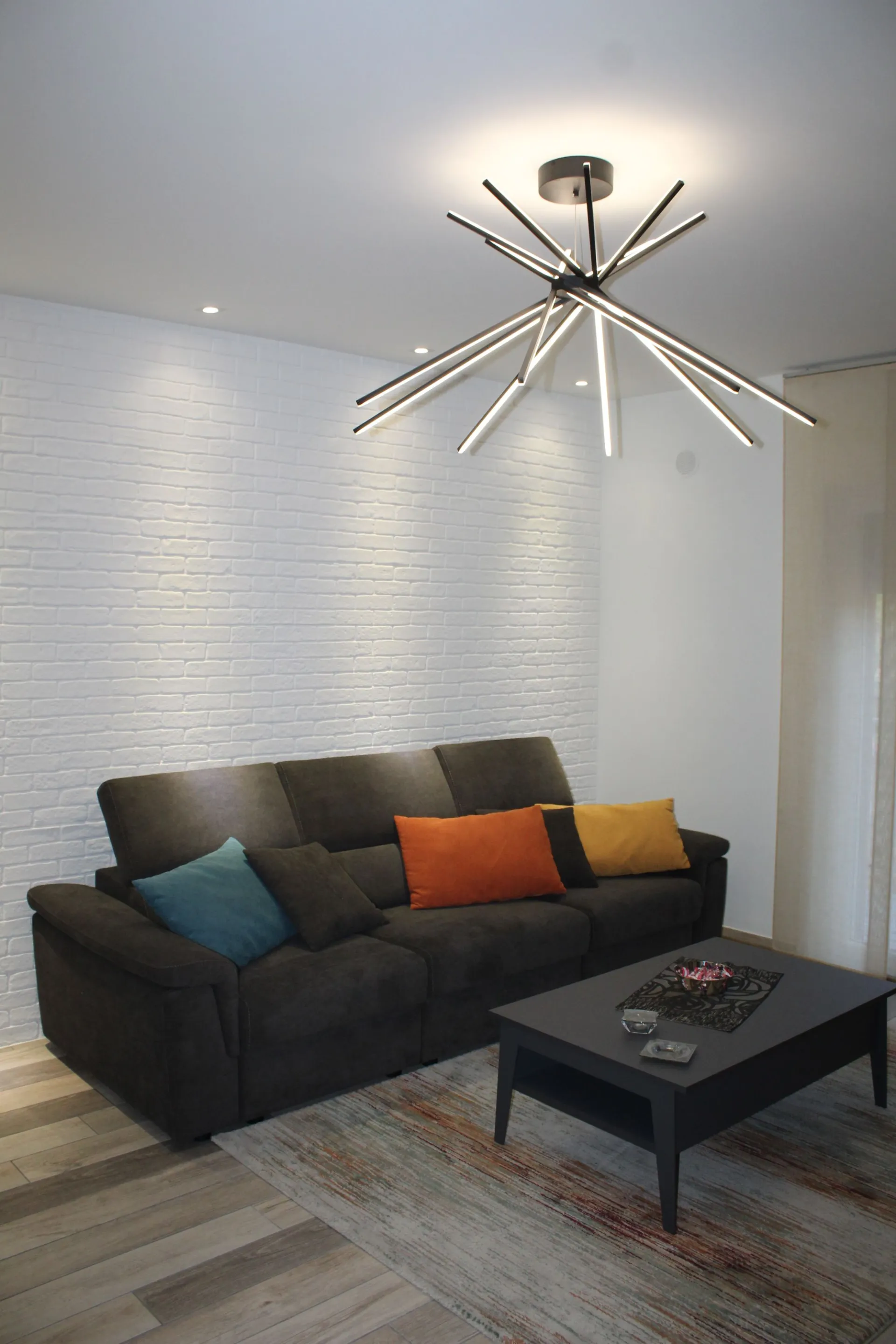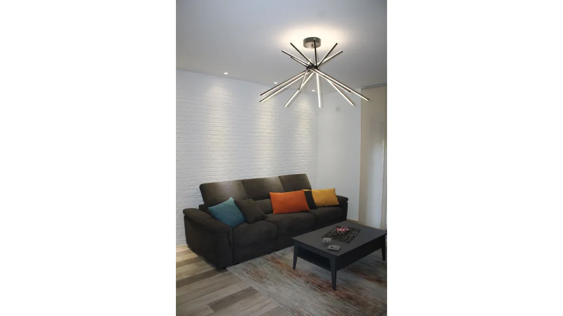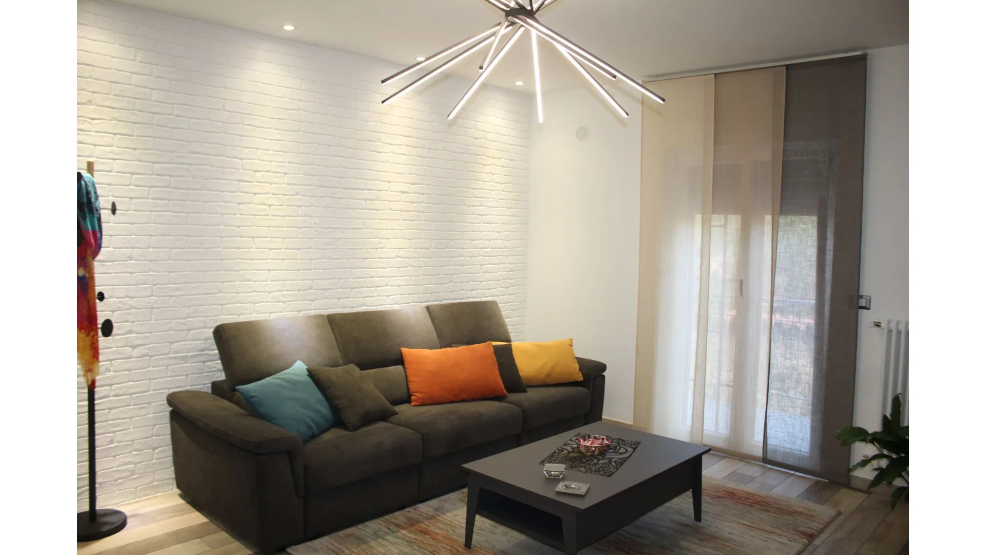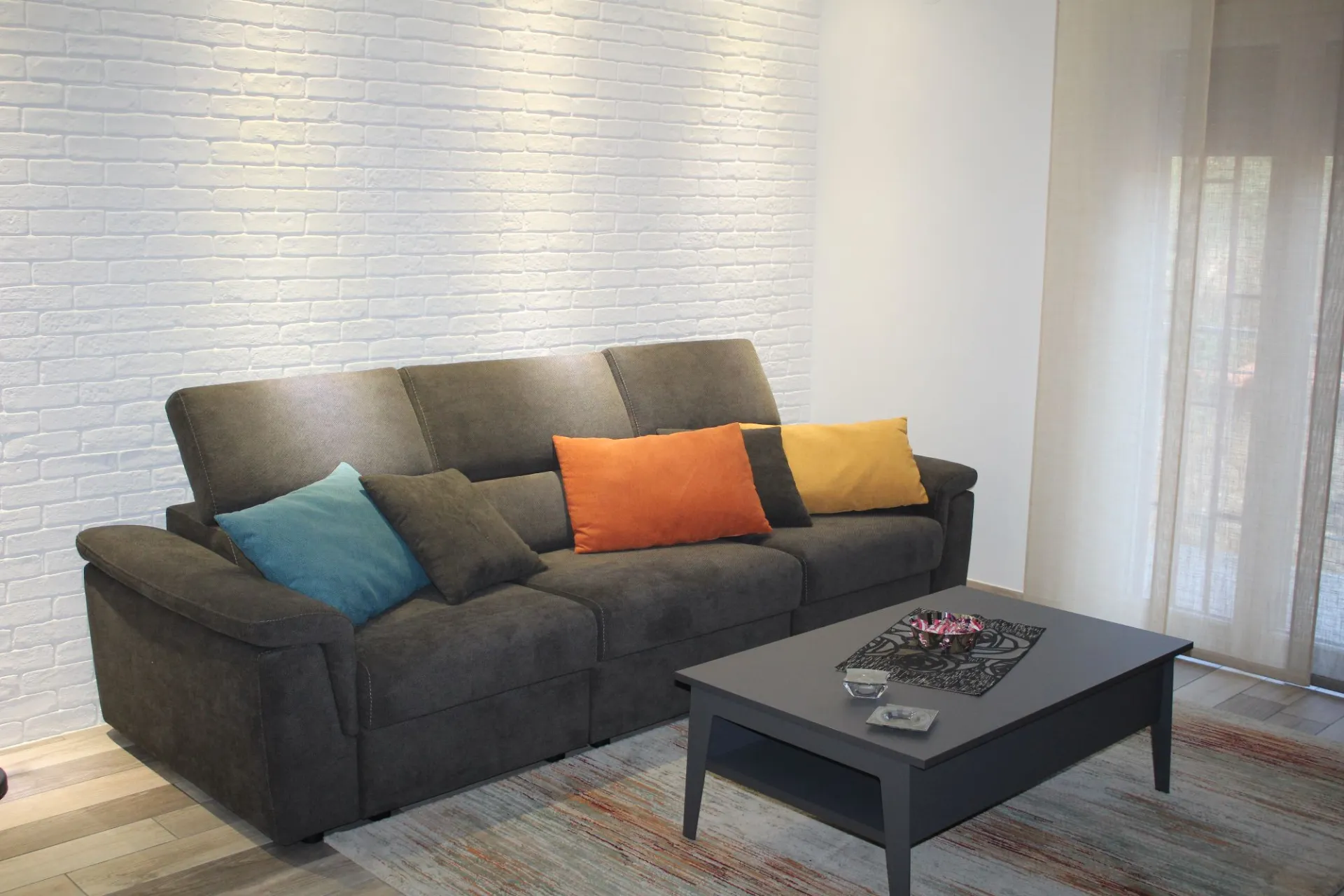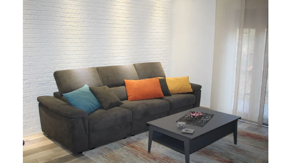 Divano lineare in tessuto impreziosito da cuscini d' arredo che esaltano il colore caldo con un tocco di vivacità