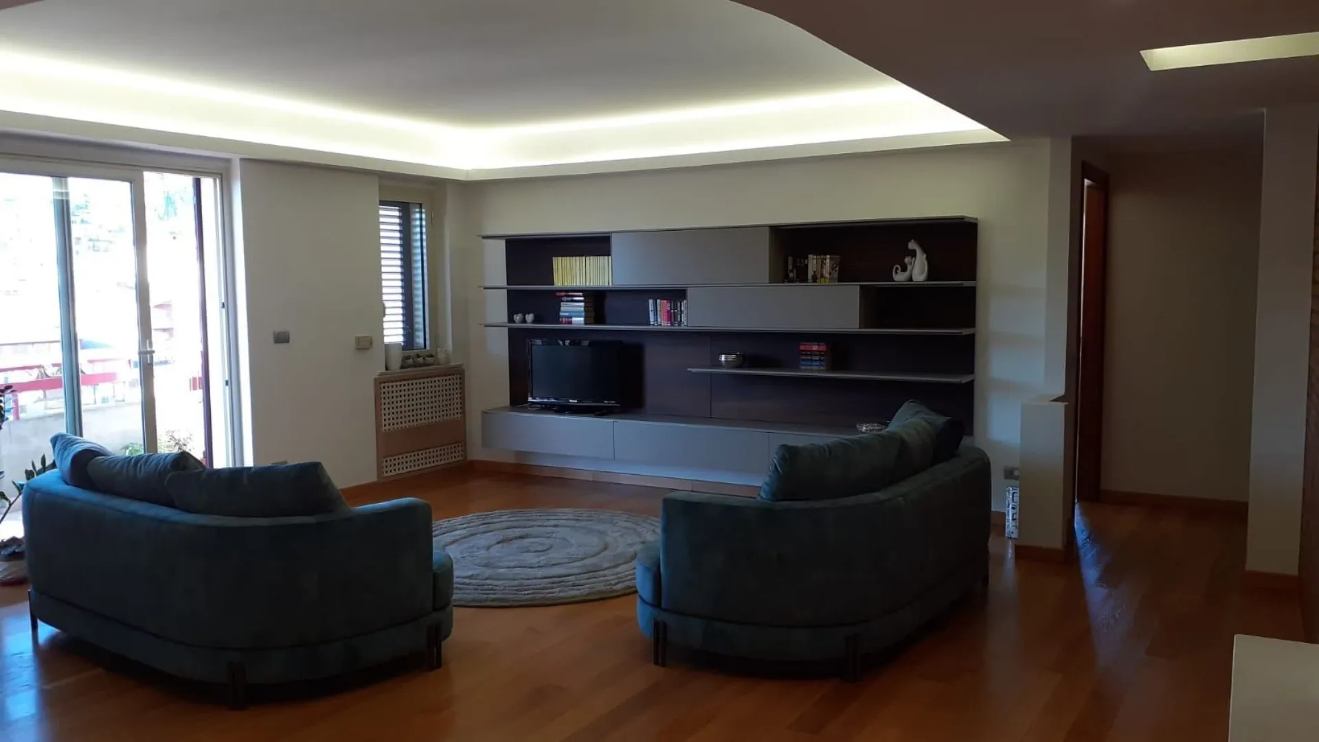Perfetto abbinamento di colori per questo soggiorno arredato con una parete attrezzata sospesa con pannelli boiserie dove si incastrano perfettamente le mensole e i pensili senza meccanismi a vista, Di fronte i due divani, Musa, dalle forme sinuose con curve avvolgenti e piedini robusti cilindrici. Per completare l' arredo il tappeto rotondo con trama a spirale